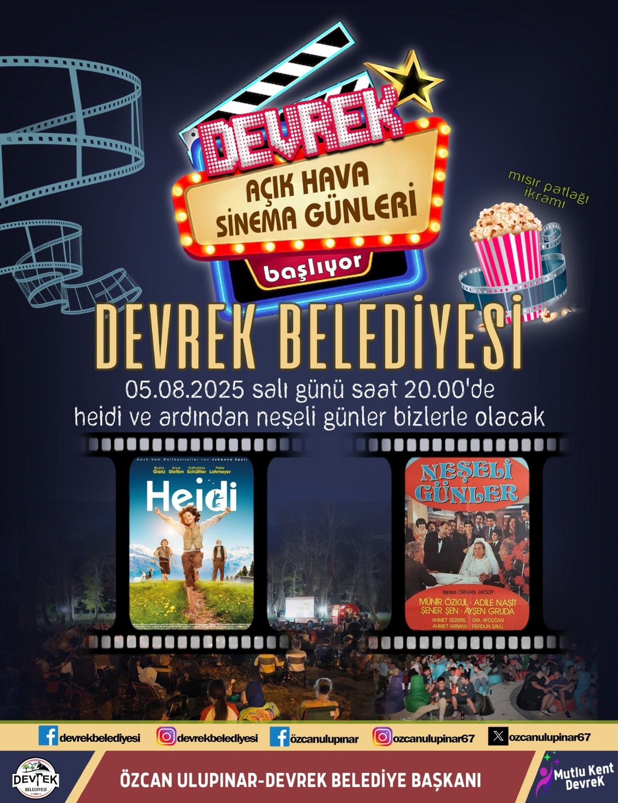 Devrek Belediyesi Egemenlik Piknik ve Mesire alanında kurulan Açık Hava Sineması nostalji Türk filmleri ile İlçe sakinlerine keyifli anlar yaşatmaya hazırlanıyor. Başkan Ulupınar, “Bu Salı Yeşilçam efsanesiyle geçmişe yolculuk yapıyoruz. Nostalji, kahkaha ve duygusal anlar bir arada. Egemenlik Piknik ve Mesire Alanına tüm halkımız davetlidir. Tüm etkinlikler ücretsizdir” dedi.