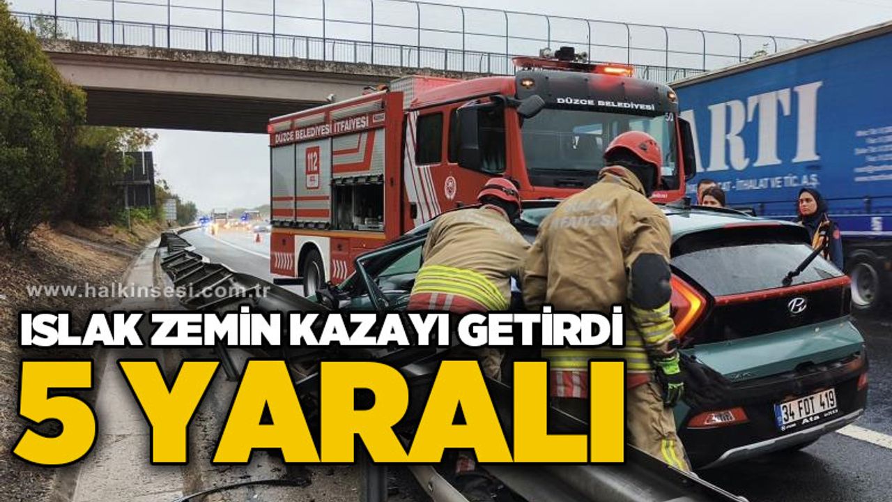 Kaza, 08.00 sıralarında Anadolu otoyolu Gümüşova ilçesi Yeşilyayla köyü mevkisinde meydana geldi. Edinilen bilgilere göre İstanbul istikametine giden Hyundai marka 34 FDT 429 plakalı suv araç yağmur nedeniyle yolun kayganlaşması sonucu sürücüsünün direksiyon hakimiyetini kaybetmesi ile aynı istikamete gitmekte olan 55 APG 186 plakalı otomobile çarptı. Kazada 55 APG 186 plakalı araç bariyerlere çarparak dururken diğer yandan Hyundai marka araç ise ters istikamete döndü ve bariyerlere çarptı. Kazada Hyundai marka aracın sürüsü araç içinde sıkıştı. Sıkışan sürücü Düzce Belediyesi İtfaiye Müdürlüğü ekiplerinin çalışmasıyla sıkıştığı yerden çıkarıldı. Kazada her iki araçta bulunan 5 kişi yaralanırken, yaralılar 112 Acil Sağlık ekiplerinin ilk müdahalesinin ardından Hendek ve Düzce’deki hastanelere kaldırıldılar. Kazayla ilgili olarak inceleme başlatıldı.