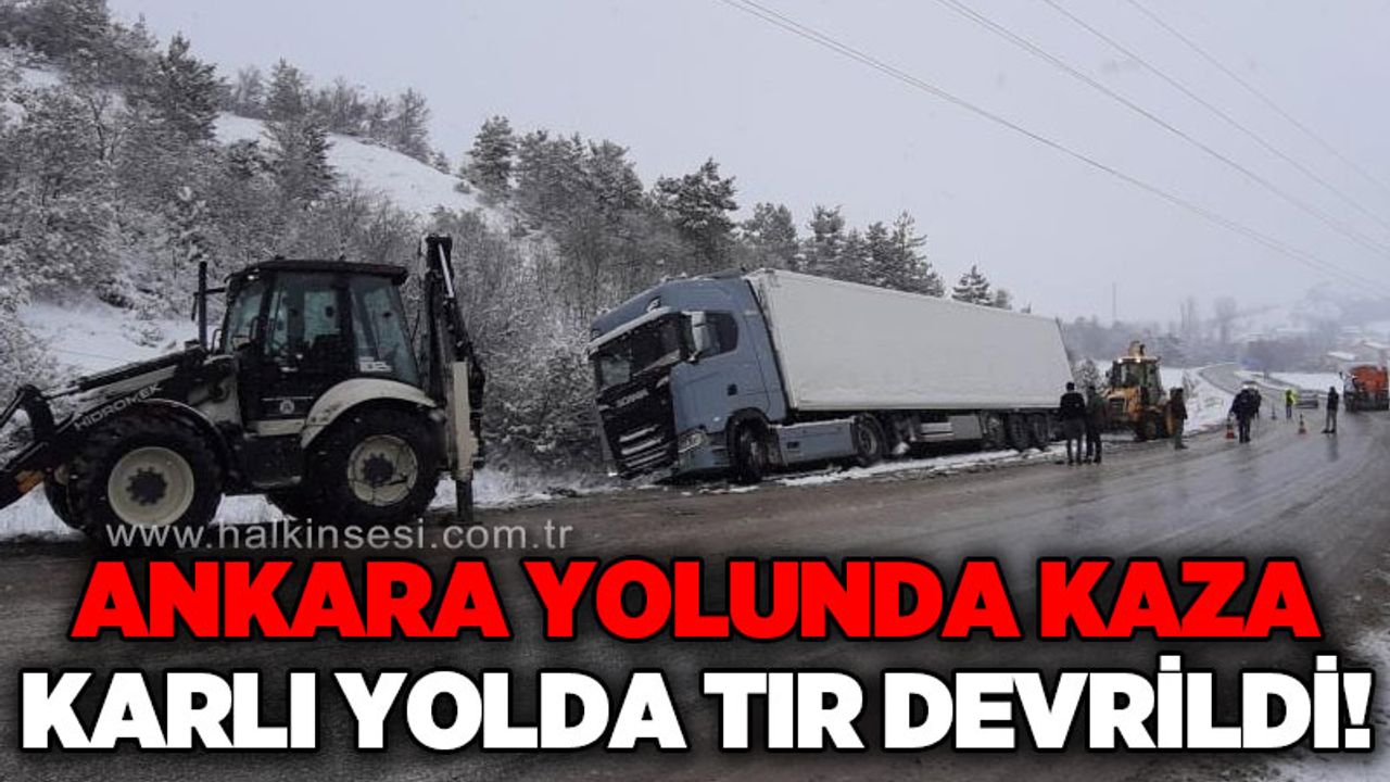 Bolu’nun Mudurnu ilçesi ile Ankara'nın Nallıhan ilçesini birbirine bağlayan karayolunda yoğun kar yağışı nedeniyle rampada kayan tır, şarampole devrildi. Yan yatan tır, bölgeye sevk edilen 2 iş makinesinin güçlükle yürüttüğü çalışma sonucu kurtarıldı.