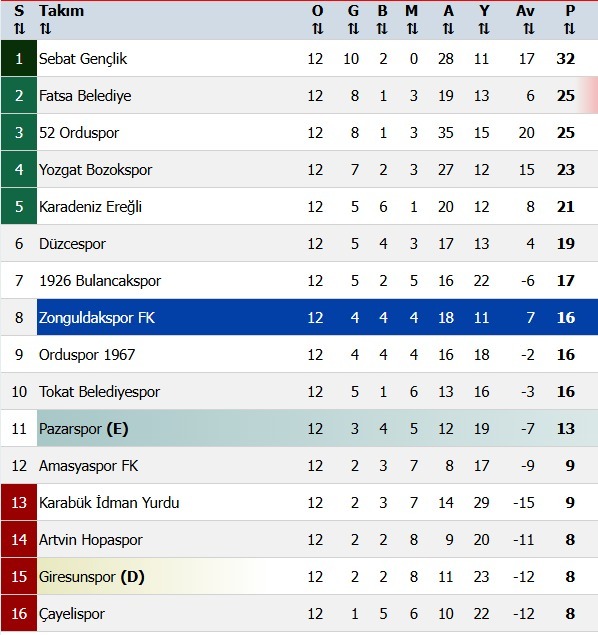 Temsilcimiz Zonguldakspor ligde oynadığı 12 maçta 4 galibiyet, 4 beraberlik 4 yenilgi alarak, 16 puanla 8. sırada yer alıyor. Kırmızı-lacivertli temsilcimiz 12 maçta kalesinde 11 gol görürken, rakip filelere ise 18 gol attı.