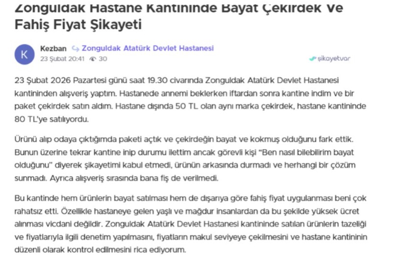 23 Şubat 2026 Pazartesi günü saat 19.30 sıralarında Zonguldak Atatürk Devlet Hastanesi kantininden alışveriş yaptığını ifade eden bir vatandaş, yaşadığı durumu kamuoyuyla paylaştı.