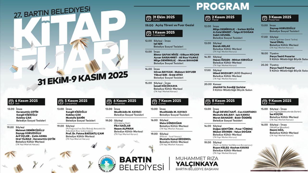 Kitapla aydınlığa sloganıyla kapıları kitapseverlere açmaya hazırlanan fuarın program çalışmaları tamamlandı. Ülke çapında çok sayıda tanınmış gazeteciyi Bartın'a getirecek olan fuarda imza günleri ve söyleşilerin yanı sıra konser de var.