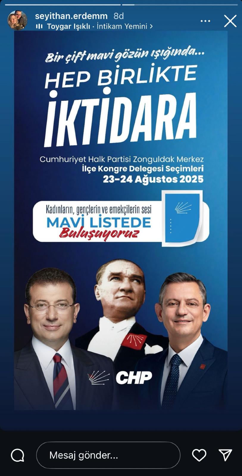 "CHP delege seçimlerine müdahil olmuyorum ve olmayacağım" demeçleri veren Zonguldak Belediye Başkanı Tahsin Erdem'in oğlu Seyithan Erdem, sosyal medya hesabından "İntikam Yemini" isimli şarkıyla Mavi Liste için hazırlanan destek afişini paylaştı. CHP önceki dönem Merkez İlçe Başkanı Ebru Uzun'un gece saatlerinde yaptığı paylaşımın ardından kasıp kavrulan Tahsin Erdem ve ekibinin bu denli paylaşımı dikkatleri üzerine çekti. Zonguldak'ta, partide ve belediyede hal ve hareketleriyle büyük tepkiler toplayan Seyithan Erdem'in bu paylaşımı da kendisi gibi tepki gördü.