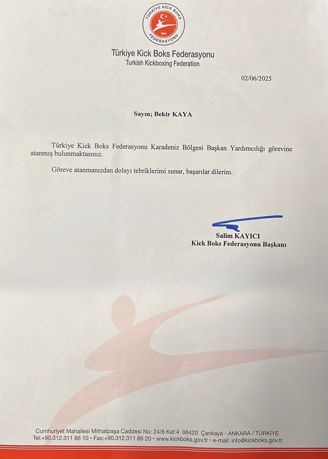 Zonguldak Kick Boks İl Temsilcisi ve Milli Takım Antrenörü Bekir Kaya, Türkiye Kick Boks Federasyon Başkanı Salim Kıyıcı tarafından Karadeniz Bölgesi Başkan Yardımcılığı görevine atandı.