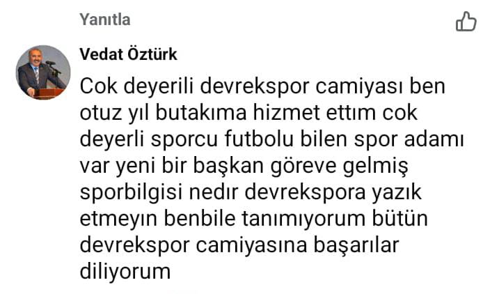 "Çok değerli Devrekspor camiası, ben otuz yıl bu takıma hizmet ettim. Çok değerli sporcu, futbolu bilen spor adamı var. Yeni bir başkan göreve gelmiş, spor bilgisi nedir? Devrekspor’a yazık etmeyin. Ben bile tanımıyorum. Bütün Devrekspor camiasına başarılar diliyorum." ifadelerine yer verdi.