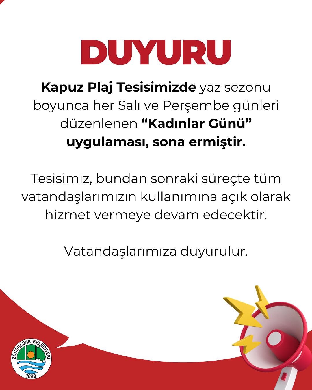 Zonguldak Belediyesi, yaz sezonu boyunca Kapuz Plaj Tesisleri’nde her Salı ve Perşembe günleri düzenlenen “Kadınlar Günü” uygulamasının sona erdiğini duyurdu.
