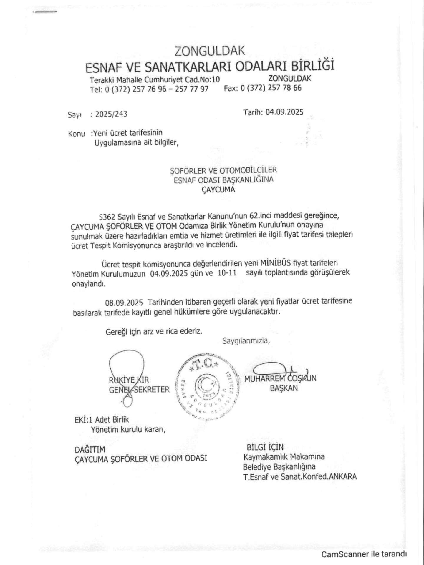 Fiyat tarifelerini belirleme yetkisi belediyemize değil, Çaycuma Şoförler ve Otomobilciler Odası Başkanlığı’na aittir. Söz konusu tarife, Zonguldak Esnaf ve Sanatkâr Odaları Birliği’ne sunulmuş, tespit komisyonunca incelenmiş ve 04.09.2025 tarihli toplantıda karara bağlanarak 08.09.2025’ten itibaren uygulanmak üzere yürürlüğe sokulmuştur.