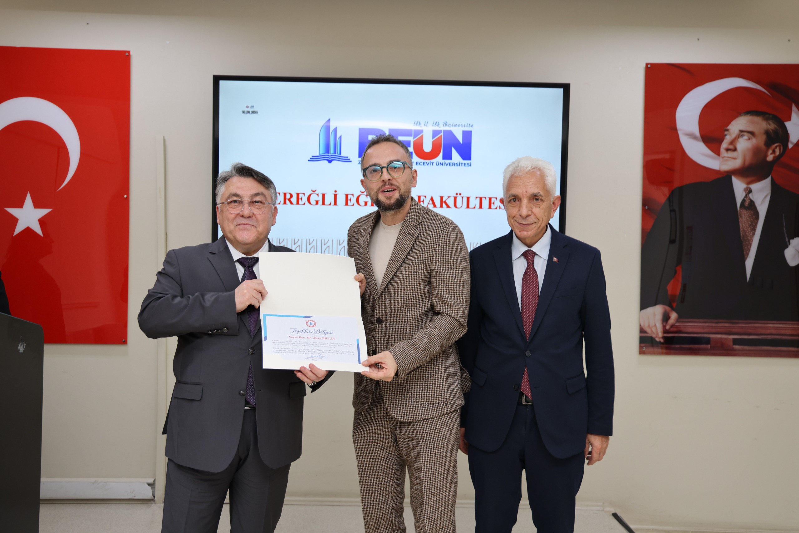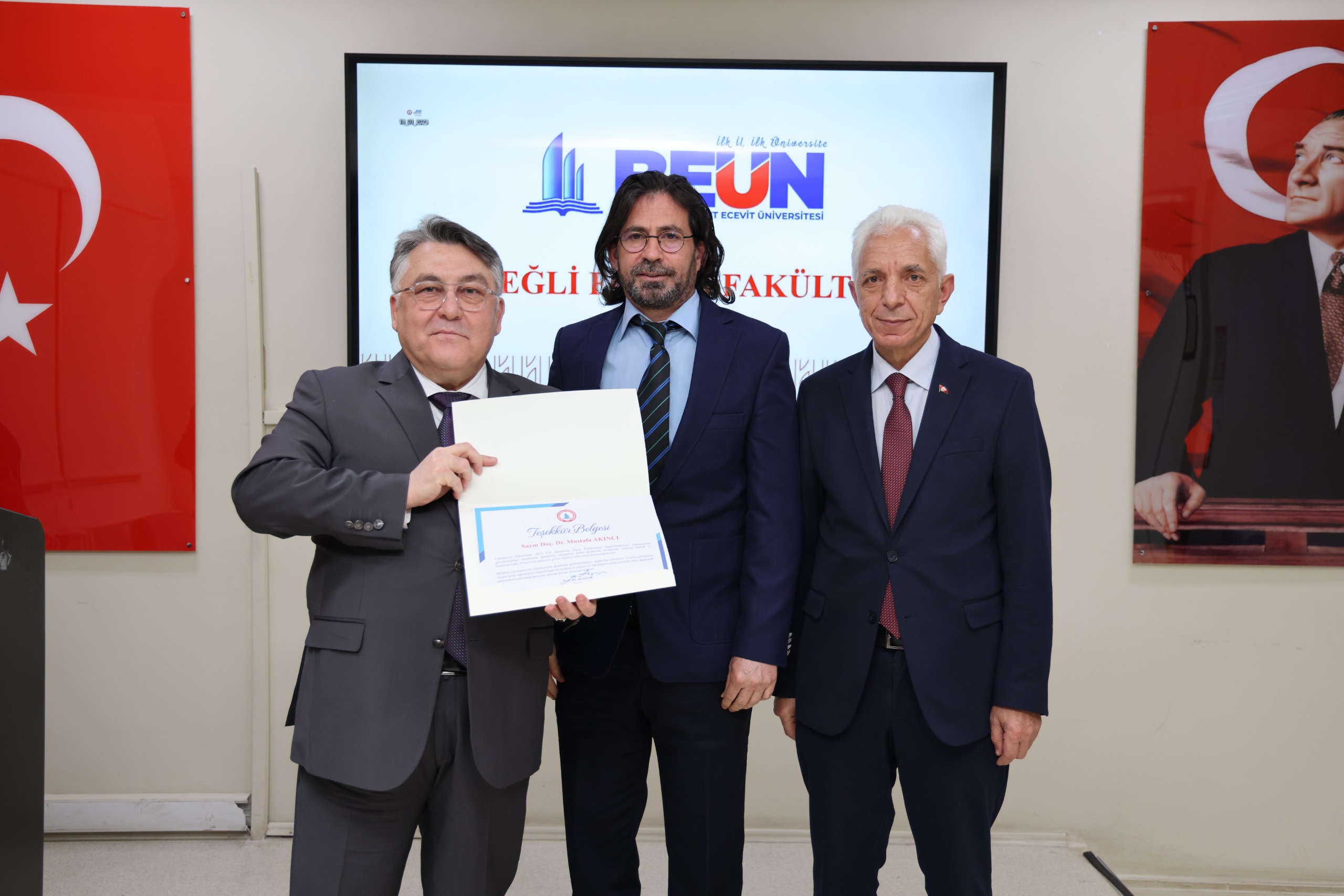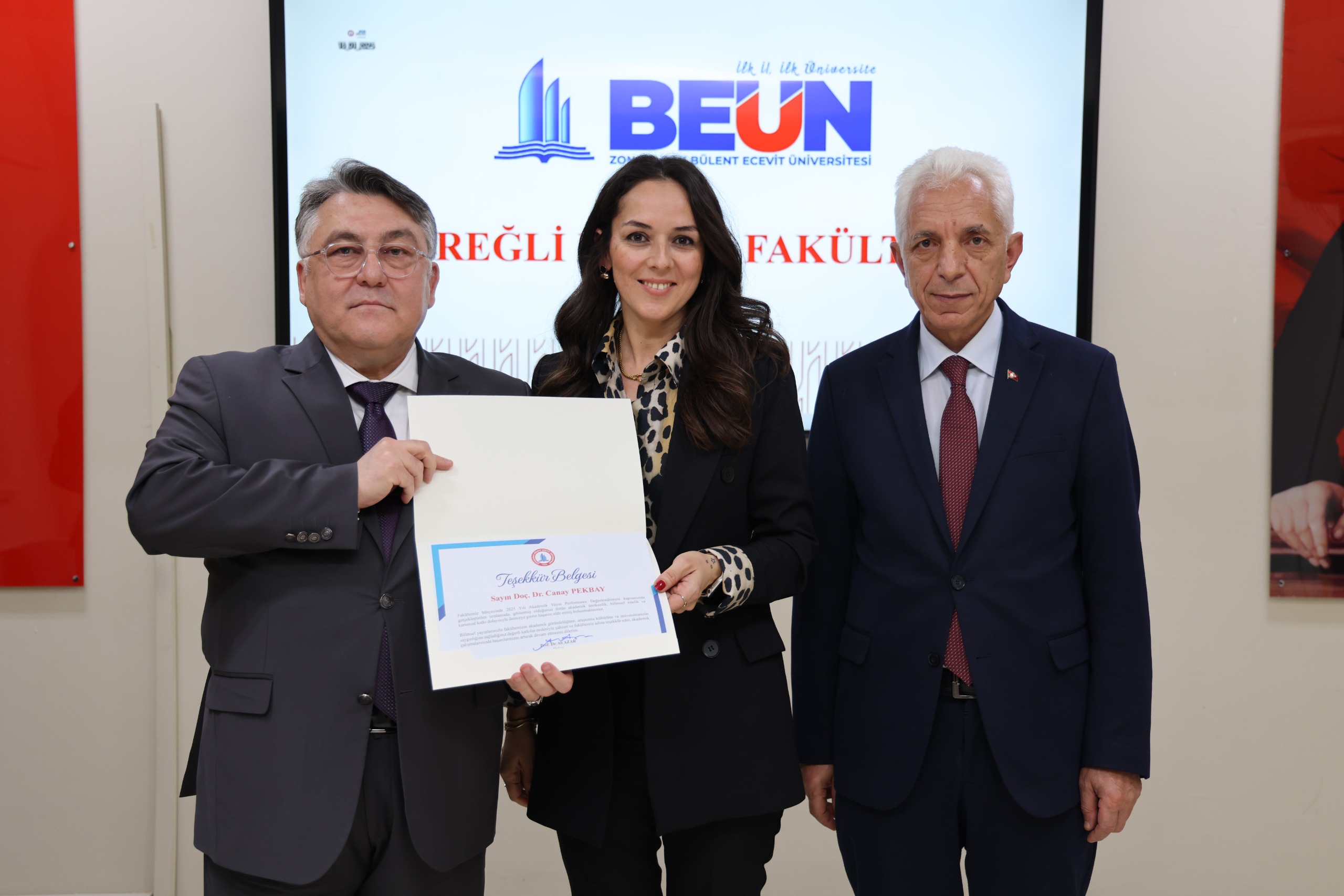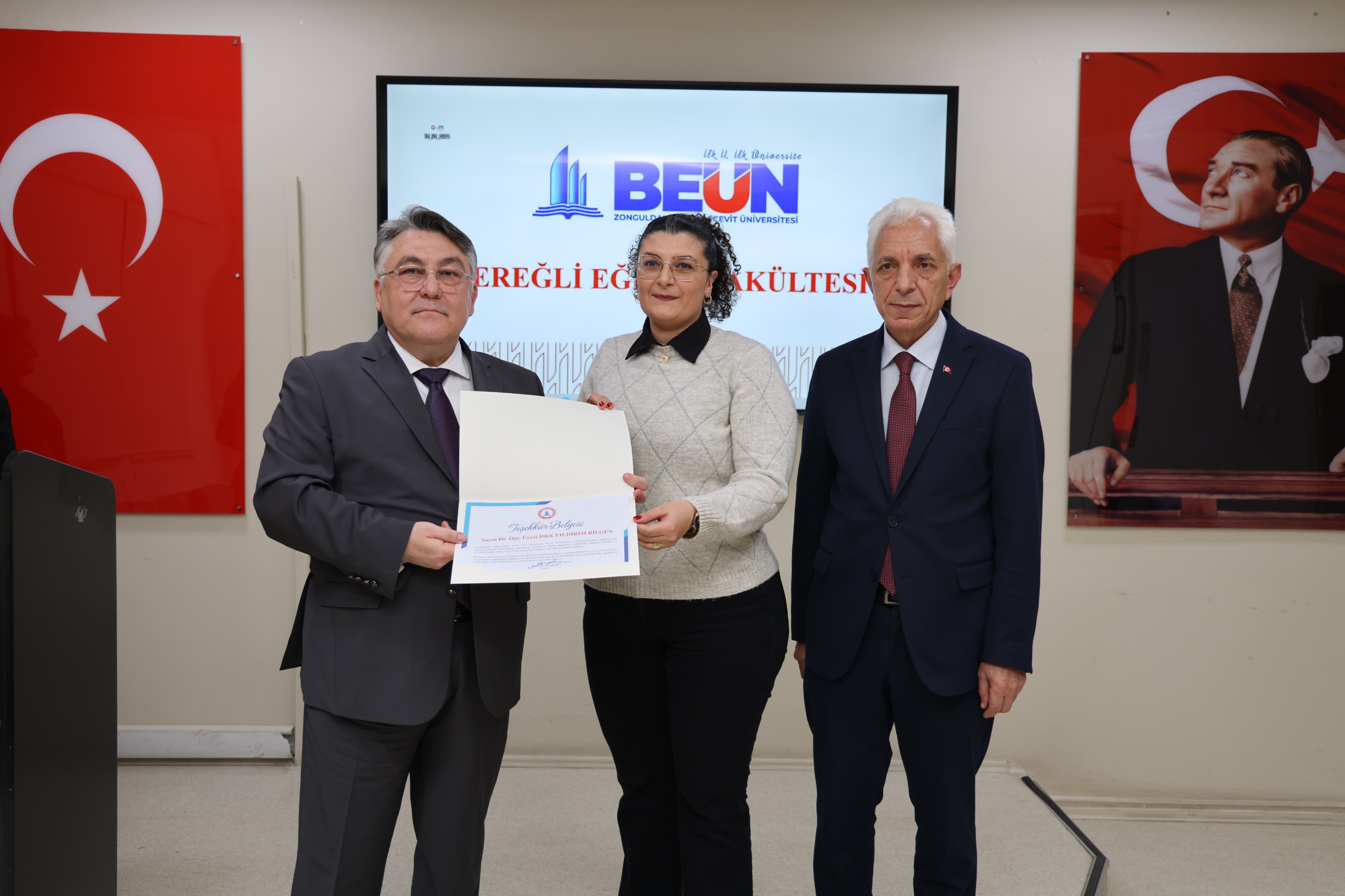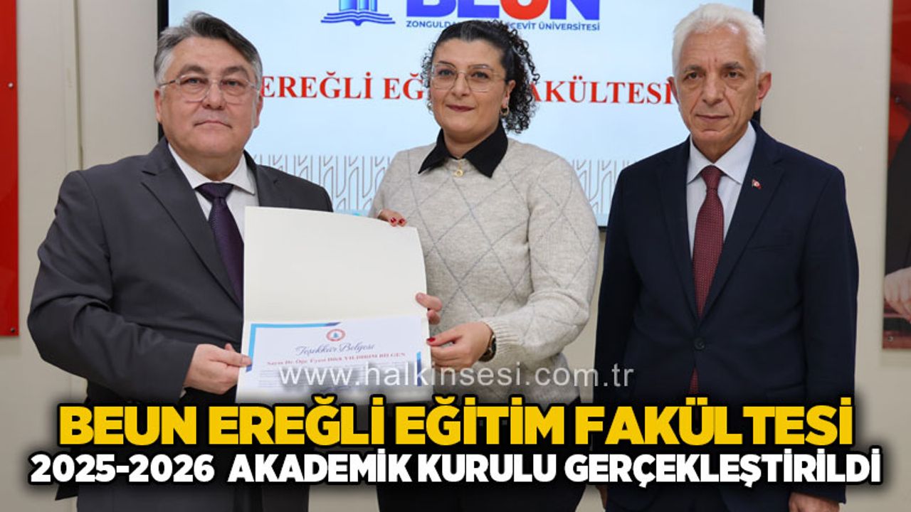 BEUN Ereğli Eğitim Fakültesi 2025-2026 Akademik Yılı Genel Kurul Toplantısı'nda BEUN Rektörü Prof. Dr. İsmail Hakkı Özölçer, ulusal ve uluslararası indekslerde yayımlanan bilimsel çalışmalarıyla ve idari görevlerdeki üstün performanslarıyla öne çıkan akademisyenlere akademik yayın ödül belgesi ile teşekkür belgelerini takdim etti. Belge takdiminin ardından toplu hatıra fotoğrafı çekilmesiyle toplantı sona erdi.