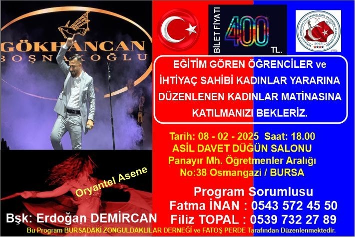 Bursa'daki Zonguldaklılar Yardımlaşma ve Dayanışma Derneği Başkanlığı tarafından 8 Şubat 2025 Cumartesi günü akşamı saat 18.00'de Asil Davet Düğün Salonu'nda eğitim gören öğrenciler ve ihtiyaç sahibi kadınlar yararına eğlence düzenlenecek.