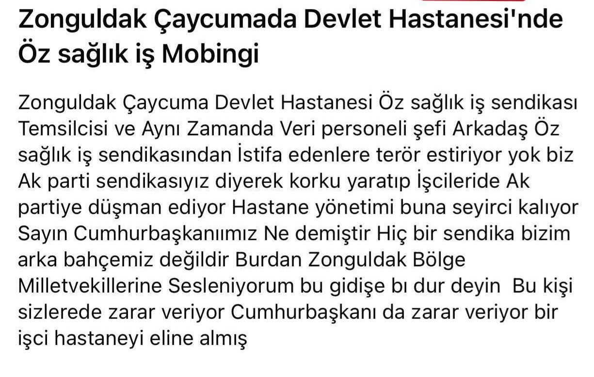 Zonguldak Çaycuma Devlet Hastanesi Öz Sağlık-İş Sendikası Temsilcisi ve aynı zamanda veri personeli şefi Arkadaş, Öz Sağlık-İş Sendikası’ndan istifa edenlere terör estiriyor. “Yok biz AK Parti sendikasıyız” diyerek korku yaratıp işçileri de AK Parti'ye düşman ediyor. Hastane yönetimi buna seyirci kalıyor.