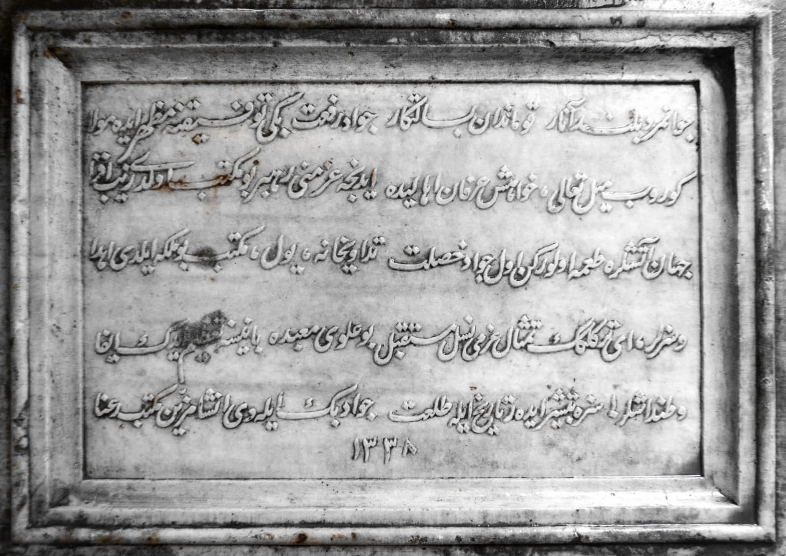 Kitabenin üzerinde, “Civanmerd-i besâletkâr, kumandan-ı sebatkâr Cevad Rif’at beği, tevfikına mazhar ide Mevla. / Görüp meyl-i te’âlî, hâhîş-i ‘irfân ahâlîde, idince azmini rehber bu mekteb oldı zîb-efzâ. / Cihân âteşlere tu’me olurken ol cevâd-haslet tedâvîhane, yol, mekteb; bu mülke eyledi ihdâ. / Ve sizler, ey Türklüğün timsal-i ‘azmi nesl-i müstakbel, Bu ‘ulvî ma’bede bânîsine ta’zîm idin îfâ. / Vatandaşlar! Size tebşir ider târîh ile Tal’at, Cevad Beğ eyledi inşa müzeyyen mekteb-i ra’nâ.1338” yazıyor.