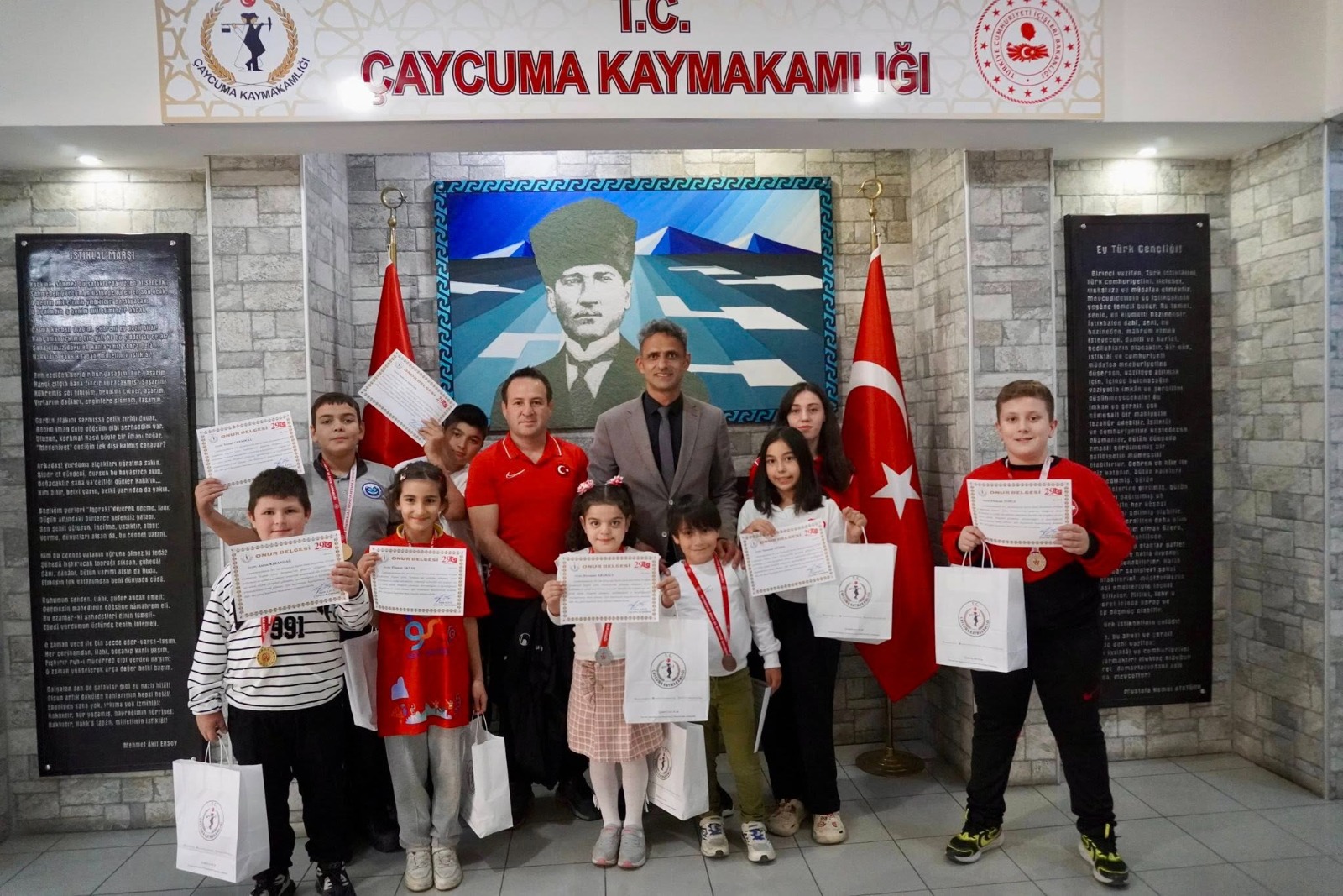 Bartın ilinde düzenlenen 29 Ekim Cumhuriyet Bayramı Güreş Turnuvası’nda dereceye giren Çaycuma Spor Kulübü Güreş Takımı sporcuları ve antrenörleri, Çaycuma Kaymakamı Adem Kaya’yı makamında ziyaret etti.
