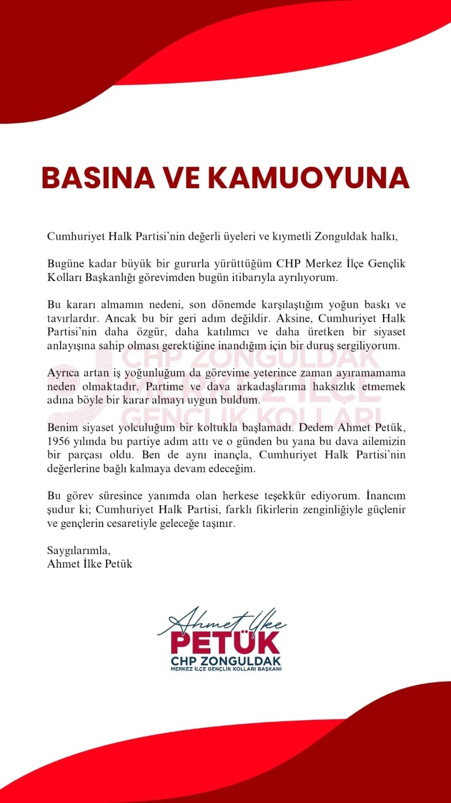Cumhuriyet Halk Partisi (CHP) Zonguldak Merkez İlçe Gençlik Kolları Başkanı Ahmet İlke Petük görevinden istifa etti. İstifa kararını kamuoyuna duyuran Petük istifa nedenini yoğun baskı ve tavırlar dolayısıyla olduğunu belirtti.
