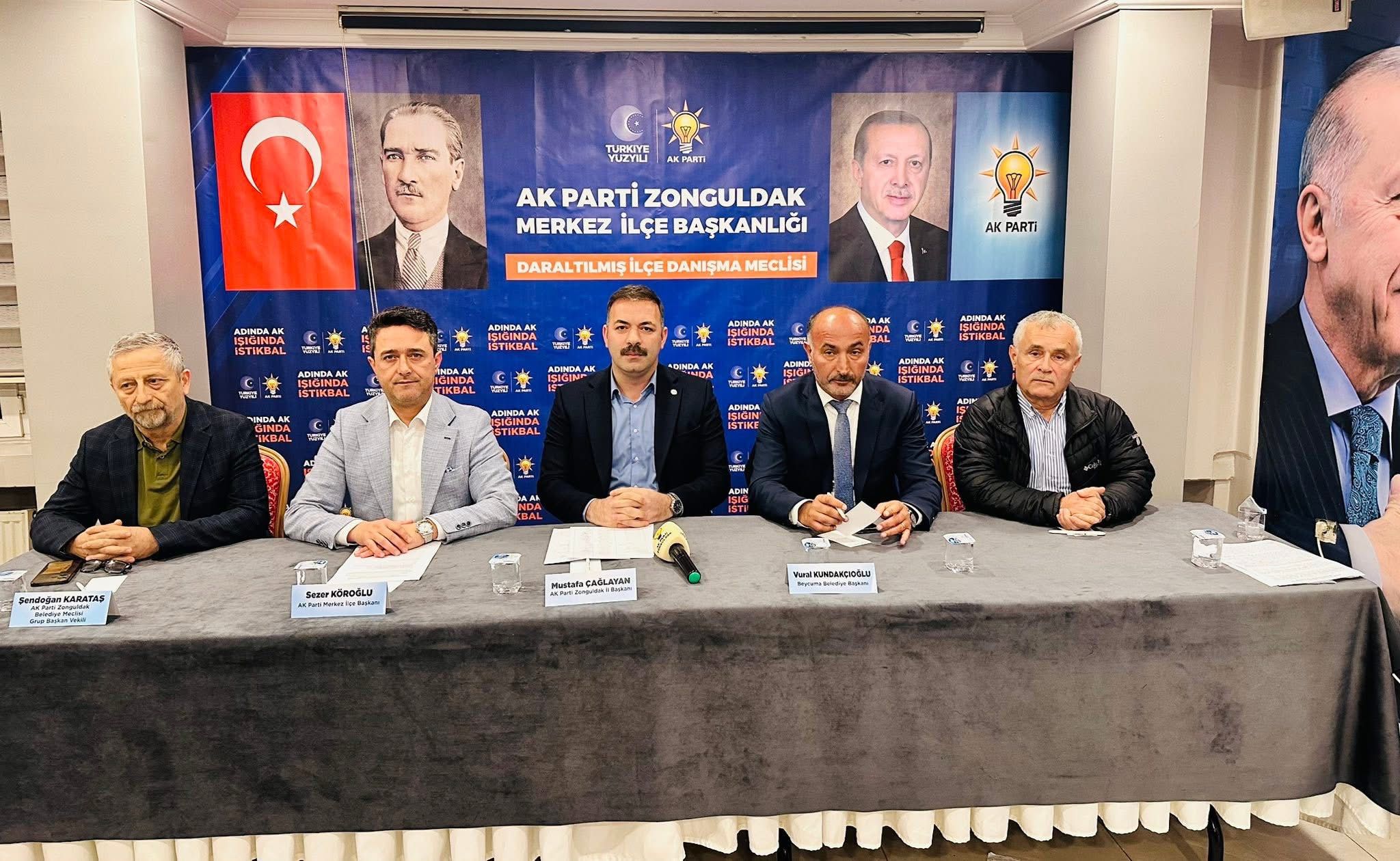AK Parti Zonguldak Merkez İlçe Başkanlığı 5.’sini düzenlediği Daraltılmış İlçe Danışma Meclisi toplantısı yapıldı. Toplantıya İl Başkanı Mustafa Çağlayan ile Beycuma Belediye Başkanı Vural Kundakçıoğlu’da katıldı. Toplantıya ayrıca, Belediye Meclis Üyeleri, İl Genel Meclisi Üyeleri, İl Kadın Kolları Başkanvekili, İl Gençlik Kolları Başkanı, İl Yönetim kurulu üyeleri, İlçe Yönetim kurulu üyeleri, Mahalle Başkanları, Köy Temsilcileri ve teşkilat mensupları katıldı.