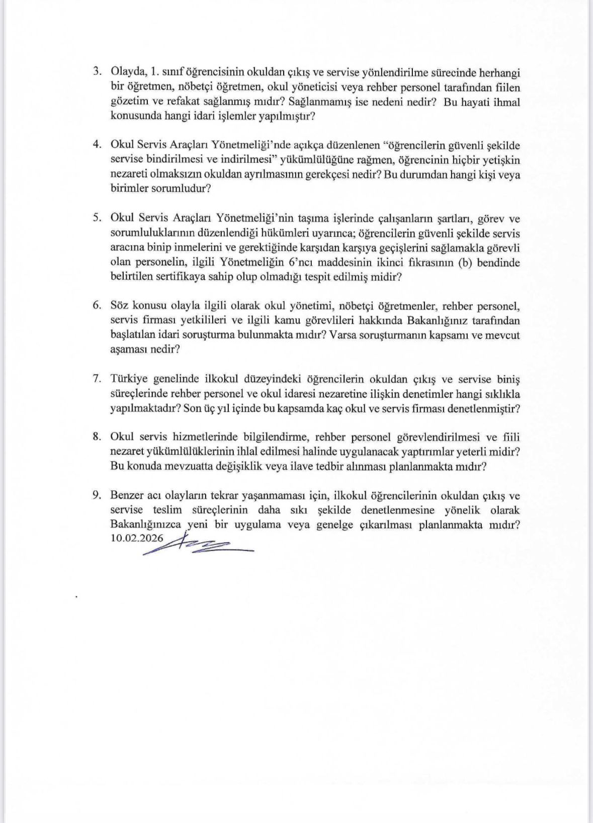 Konuyla ilgili olarak başta Millî Eğitim Bakanlığı olmak üzere dört ayrı bakanlığa ayrı ayrı soru önergelerimizi verdik. Olayın tüm yönleriyle araştırılarak aydınlatılması, sorumluların ortaya çıkarılması ve benzer acı olayların tekrar yaşanmaması için ayrıca araştırma önergelerimizi de Türkiye Büyük Millet Meclisi Başkanlığına sunacağız.
