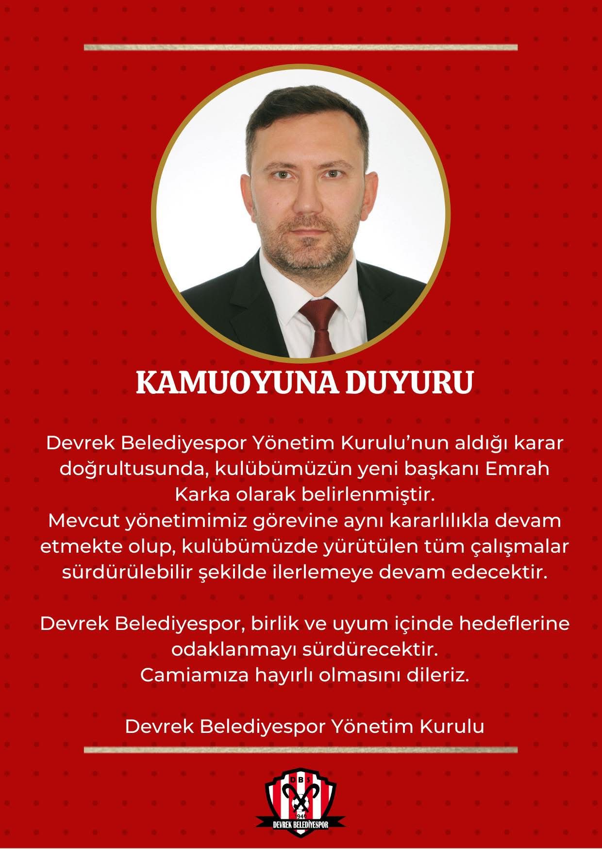 " Devrek Belediyespor Yönetim Kurulu’nun aldığı karar doğrultusunda, kulübümüzün yeni başkanı Emrah Karka olarak belirlenmiştir. Mevcut yönetimimiz görevine aynı kararlılıkla devam etmekte olup, kulübümüzde yürütülen tüm çalışmalar sürdürülebilir şekilde ilerlemeye devam edecektir.Devrek Belediyespor, birlik ve uyum içinde hedeflerine odaklanmayı sürdürecektir.