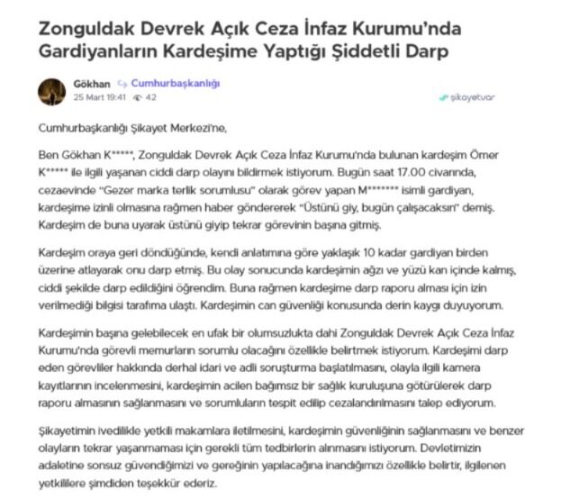Ben Gökhan K*****, Zonguldak Devrek Açık Ceza İnfaz Kurumu’nda bulunan kardeşim Ömer K***** ile ilgili yaşanan ciddi darp olayını bildirmek istiyorum. Bugün saat 17.00 civarında, cezaevinde “Gezer marka terlik sorumlusu” olarak görev yapan M******* isimli gardiyan, kardeşime izinli olmasına rağmen haber göndererek “Üstünü giy, bugün çalışacaksın” demiş. Kardeşim de buna uyarak üstünü giyip tekrar görevinin başına gitmiş.