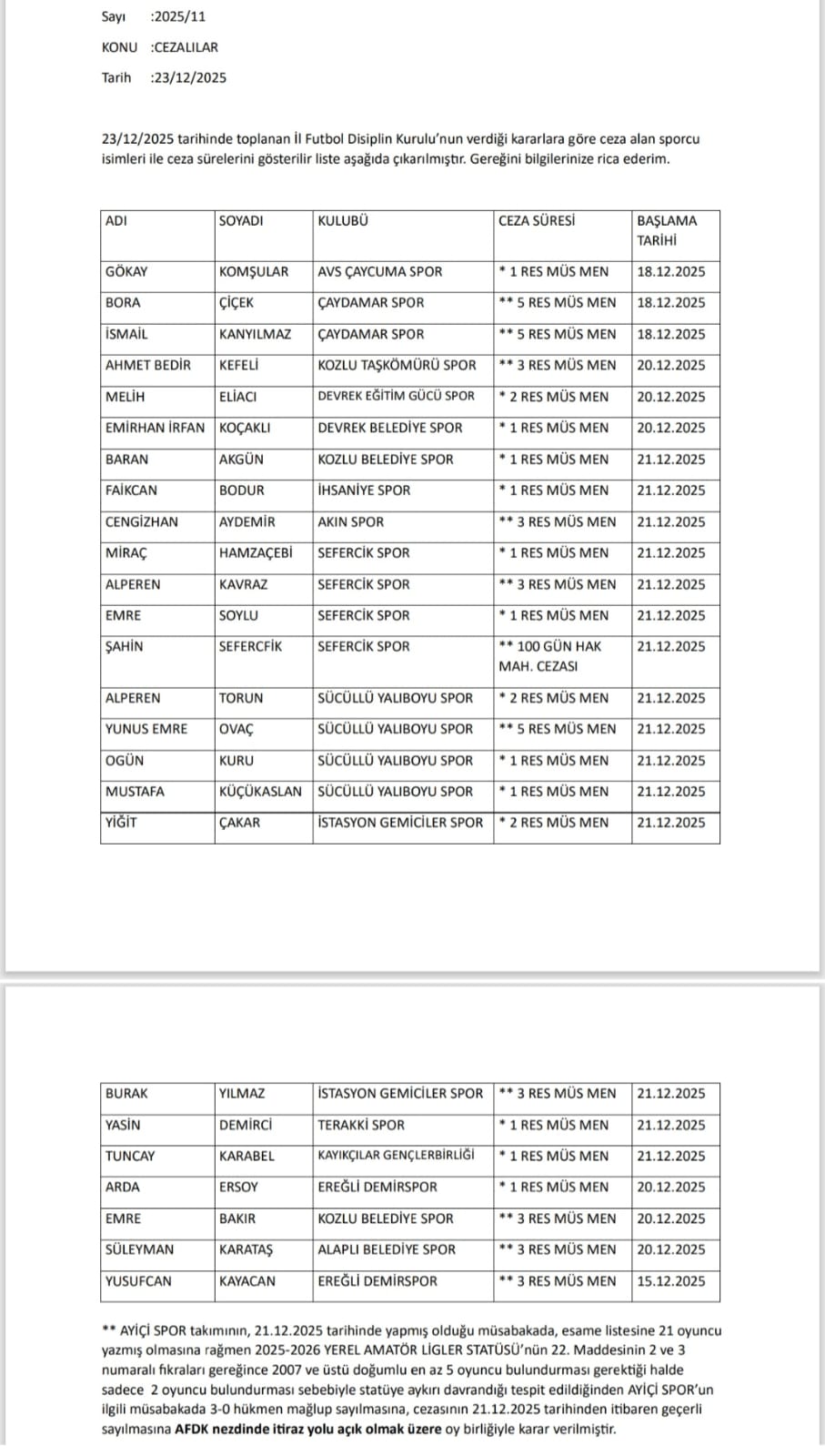 Zonguldak Futbol İl Disiplin Kurulu, çeşitli sahalarda oynanan ve sportmenliğe aykırı hareket eden futbolcular, teknik direktörler ve idarecilerinin cezalarını açıkladı.