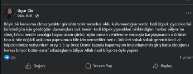 "Böyle bir karalama olmaz yazıktır günahtır terör meselesi oldu kullanmadığım yerde kedi köpek yiyeceklerini biriktirdiğim için gördüğüm davranışlara bak benim kedi köpek yiyecekleri biriktirdiğimi herkes biliyor bu süreç bitsin bende savcılığa başvurucam çünkü hiçbir zaman zehirlenme vakasıyla karşılaşmadım o ürünler bozuk bile değildi açıklama yapmamıza bile izin vermediler ben o ürünleri sokak sokak gezerek kedi ve köpeklerimize veriyordum orayı 2 3 ay önce Demir kapıyla kapatmıştım imalathanemin giriş katta olduğunu herkes biliyor bütün esnaf arkadaşlarım biliyor Allah nasıl biliyorsa öyle yapsın"