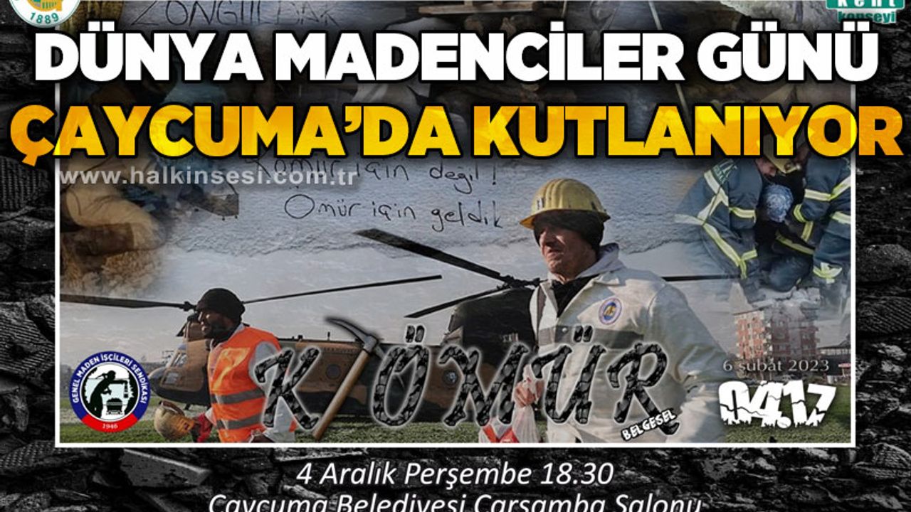 Çaycuma Belediyesi Çaycuma Kent Konseyi ile birlikte 4 Aralık Dünya Madenciler Günü nedeniyle bazı etkinlikler yapacak. Kutlamalar çerçevesinde Gürkan Gündoğan’ın K-Ömür belgeselinin gösterimi yapılırken Ekrem Murat Zaman ve Ufuk Çeyrek Ural’la söyleşi ve imza günü imza günü gerçekleştirilecek.