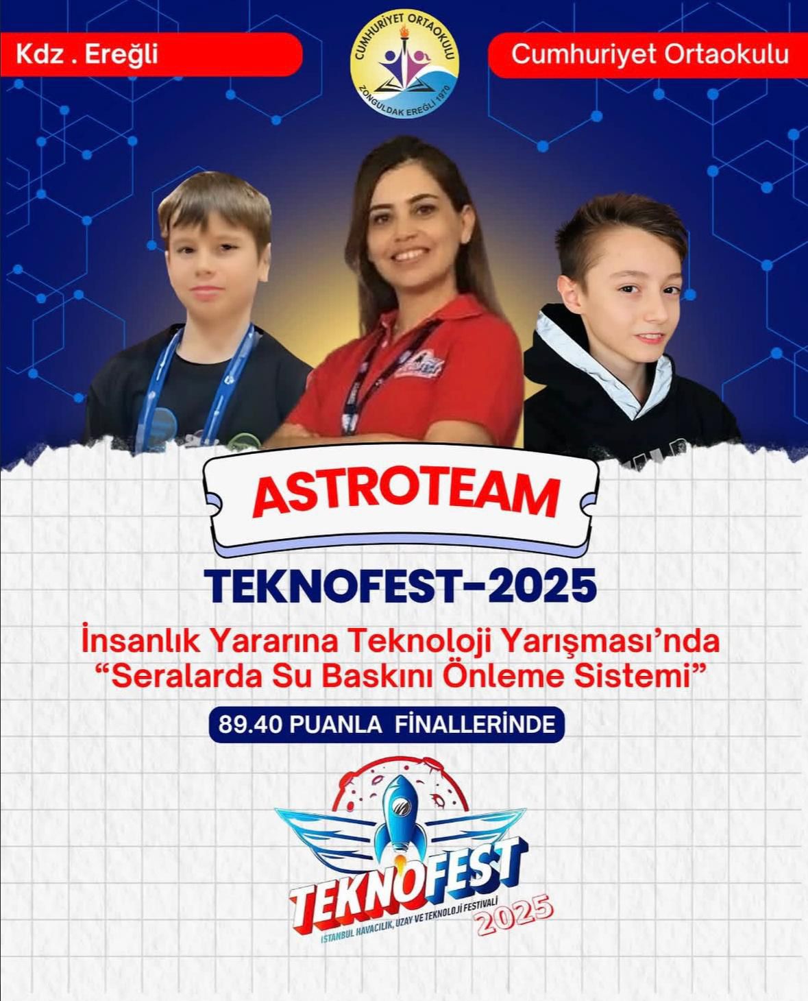 Cumhuriyet Ortaokulu’ndan danışman öğretmen Ceren AKBAŞ, takım kaptanı Oğuz Koray BARAN ve takım üyesi Arda AKBAŞ, İnsanlık Yararına – Afet Yönetimi kategorisinde geliştirdikleri “Seralarda Su Baskınını Önleme Sistemi” ile finallere katılıyor. Proje, iklim değişikliğinin yol açtığı afetlere karşı ülkemiz için daha dayanıklı bir tarım modeli geliştirmeyi amaçlıyor.
