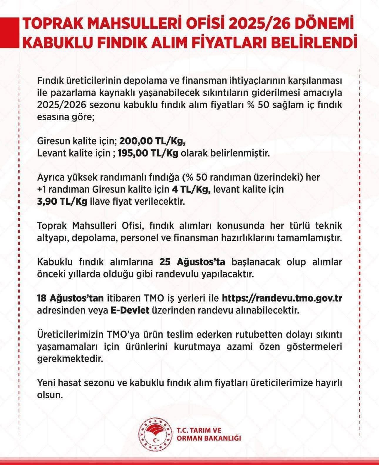 Toprak Mahsulleri Ofisi’nden yapılan yazılı açıklamaya göre Giresun kalite fındığın kilogramı 200 Lira, Levant kalite fındığın kilogramı 195 Lira olarak belirlendi.