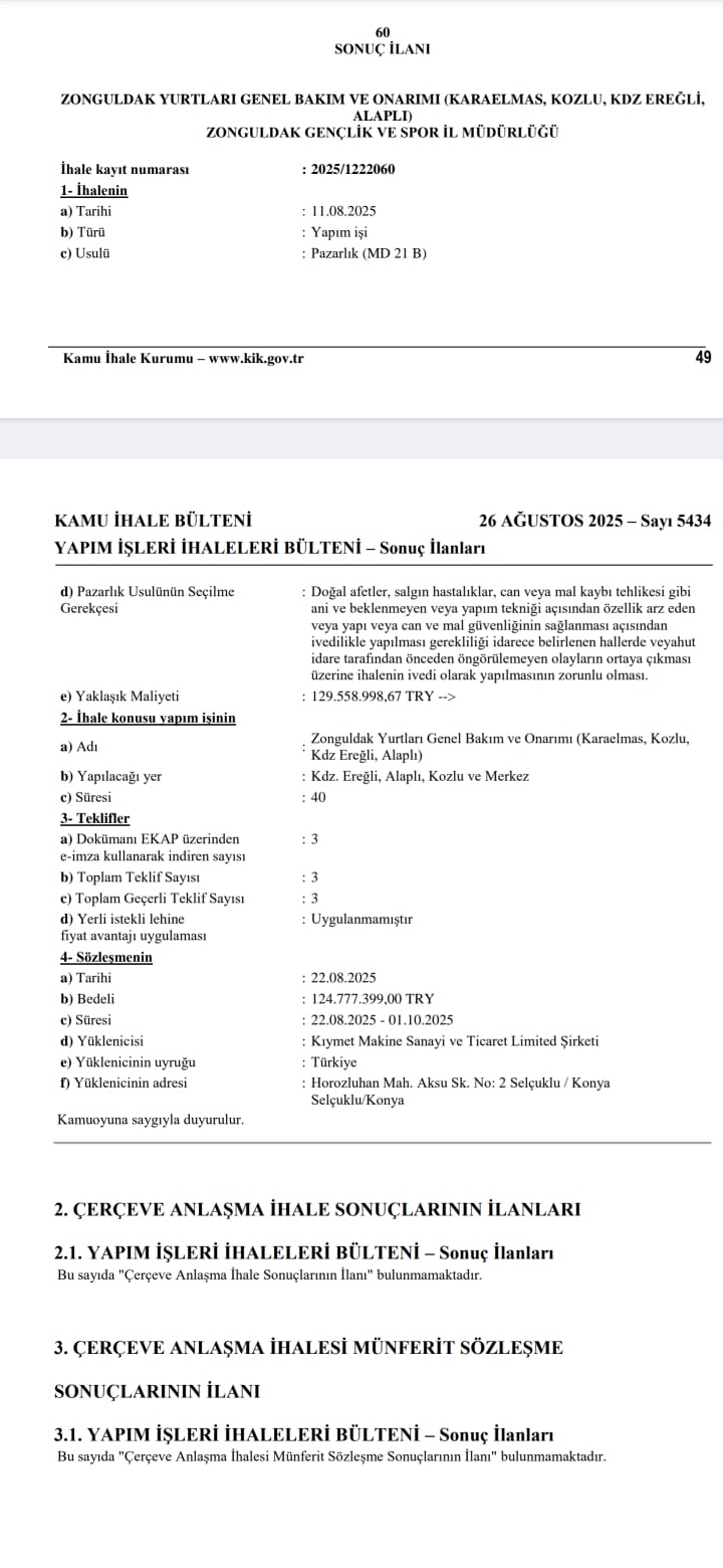 Gençlik ve Spor İl Müdürlüğü Karaelmas, Kozlu, Kdz. Ereğli ve Alaplı 'da ki öğrenci yurtlarının bakım onarım işini davetiye usulü ile ihale etti. Üç göstermelik firmanın katıldığı ihale yüzde 2 kırım ile Konya'lı firmaya kaldı.Konya'nın Selçuk ilçesindeki Kıymet Makine Sanayi Ltd.Şti. firması ihaleyi 124 milyon 777 bin 399 TL'ye aldı. Kamuya iş yapan firmalar yüzde 25-30 kırımla iş alırken, Konyalı firmaya ballı börek işi kimin sipariş ettiği ise merak konusu oldu. Üniversitelerin açılacağı tarihte bakım onarım işinin ihale edilmesi ise iş bilmezlik olarak yorumlanırken bu işleri Zonguldak'ta yapacak onlarca firma varken Konyalı firmaya kıyak ihaleden kimlerin nemalandığı merak konusu oldu.