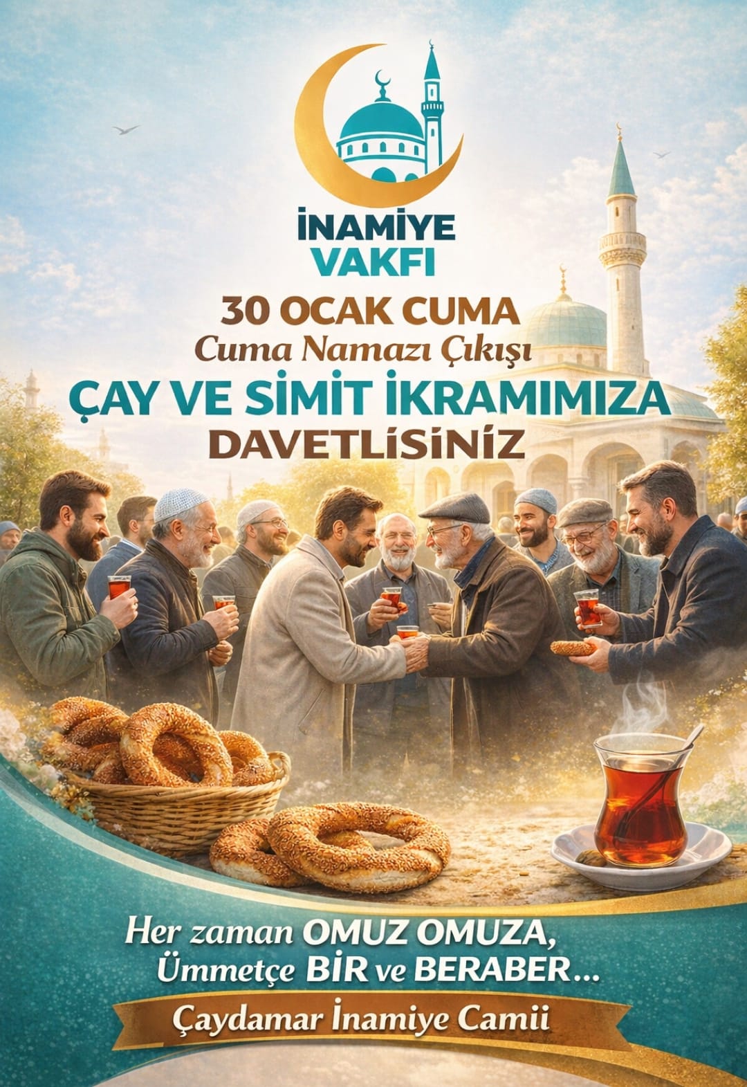 Zonguldak’ta faaliyet gösteren İnamiye Vakfı, birlik ve beraberlik mesajı verdiği anlamlı bir etkinliğe imza atıyor. Vakıf tarafından yapılan duyuruya göre, 30 Ocak Cuma günü Cuma namazının ardından Çaydamar İnamiye Camii’nde vatandaşlara çay ve simit ikramında bulunulacak.