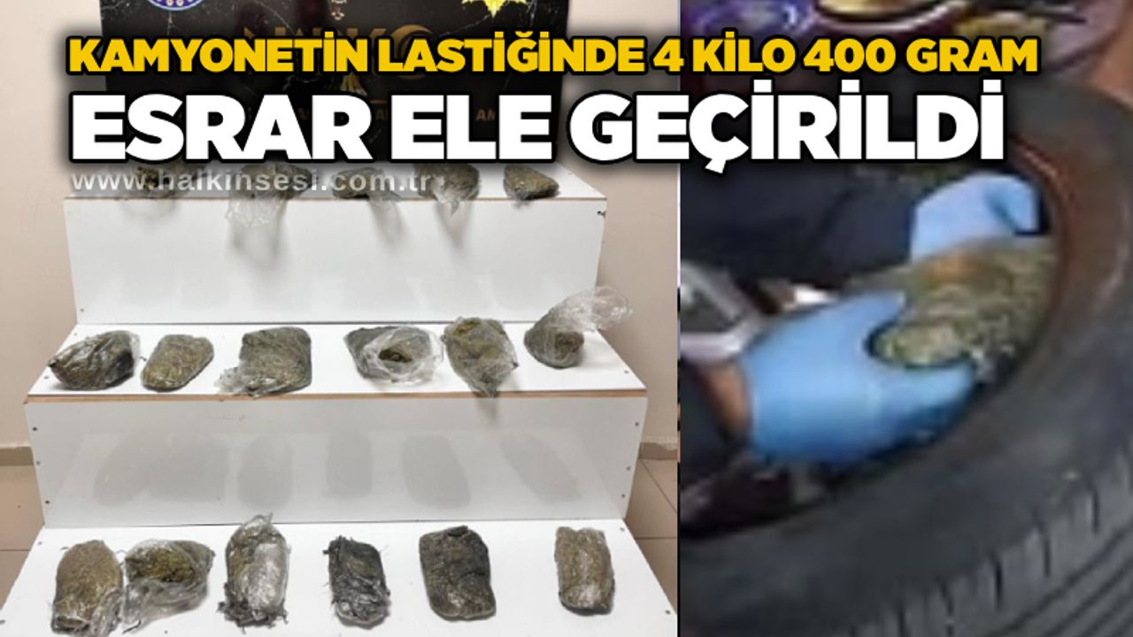 Erciş İlçe Emniyet Müdürlüğü'ne bağlı Narkotik Suçlarla Mücadele Büro Amirliği ekiplerince kapalı kasa hafif ticari kamyonette narkotik köpeği ile arama yapıldı. Yapılan aramada sağ arka lastiğe gizlenmiş 4 kilo 400 gram esrar ele geçirilirken, olayla ilgili 3 şüpheli gözaltına alındı. Erciş Cumhuriyet Savcısı talimatıyla gözaltına alınan 3 şüpheli çıkarıldıkları adli makamlarca tutuklandı.
