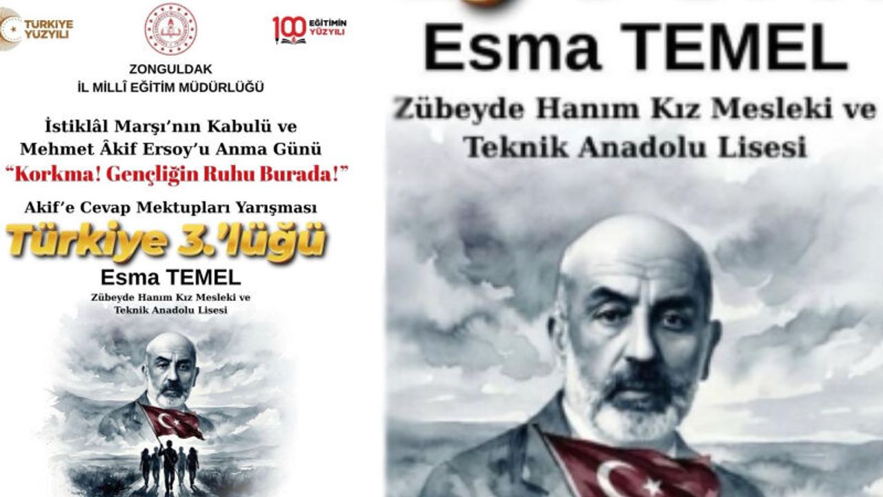 Karadeniz Ereğli’nden bir öğrenci daha Türkiye derecesi elde ederek ilçeye gurur yaşattı. İstiklal Marşı’nın kabulü ve Mehmet Akif Ersoy’u Anma Günü etkinlikleri kapsamında düzenlenen “Akif’e Cevap Mektupları” yarışmasında önemli bir başarı elde edildi.
