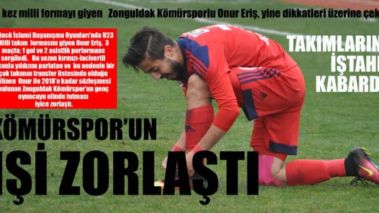 4’üncü İslami Dayanışma Oyunları’nda U23 Milli takım formasını giyen Onur Eriş, 3 maçta; 1 gol ve 2 asistlik performans sergiledi. Bu sezon kırmızı-lacivertli takımla yıldızını parlatan ve bu nedenle bir çok takımın transfer listesinde olduğu bilinen Onur ile 2018’e kadar sözleşmesi bulunan Zonguldak Kömürspor’un genç oyuncuyu elinde tutması iyice zorlaştı.