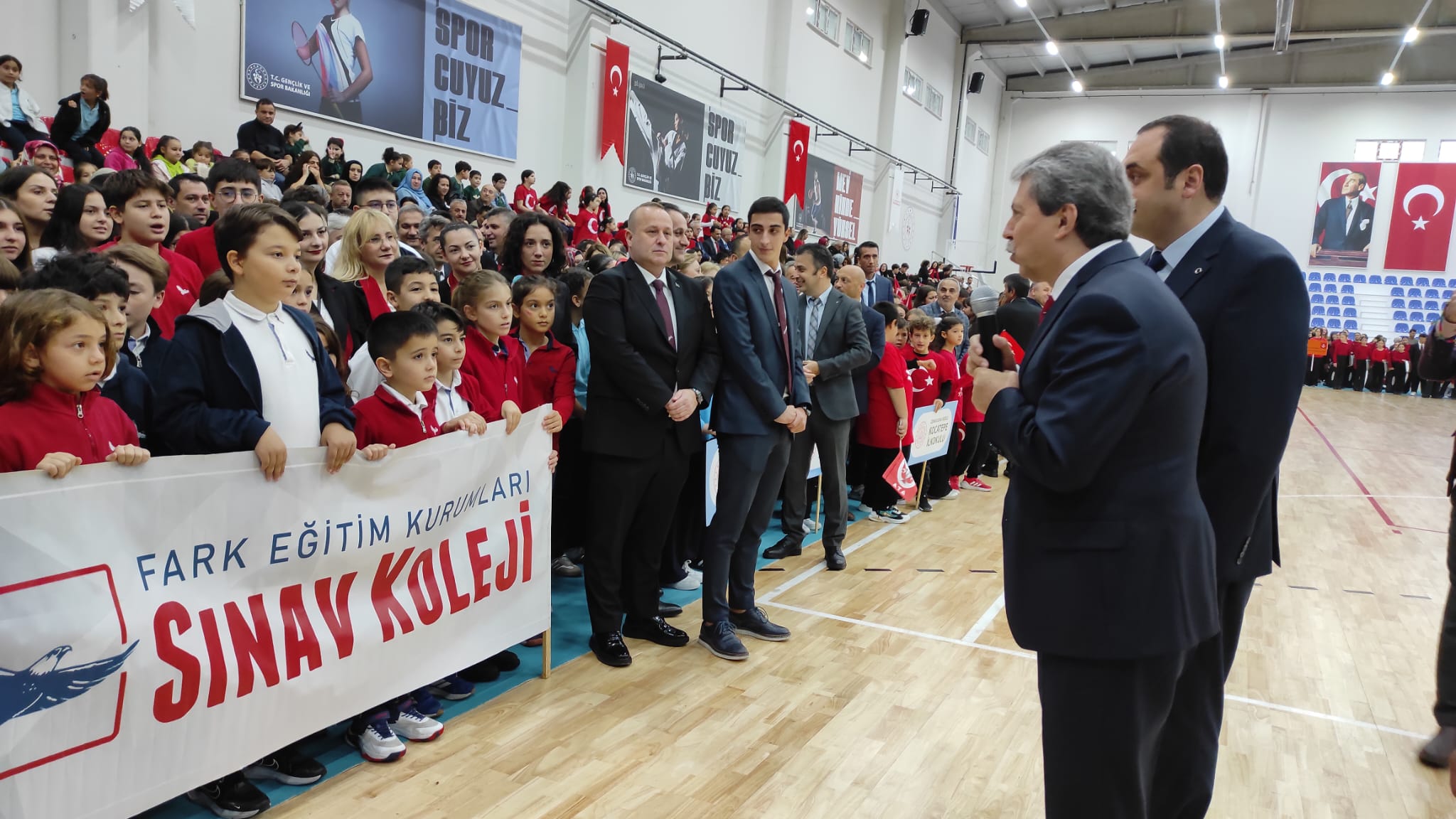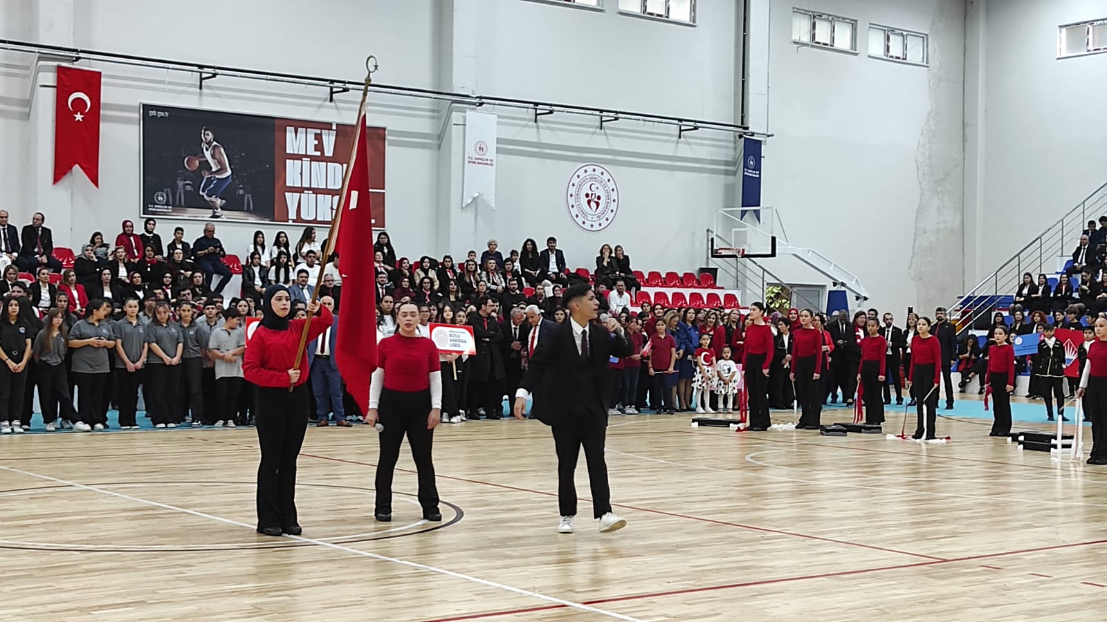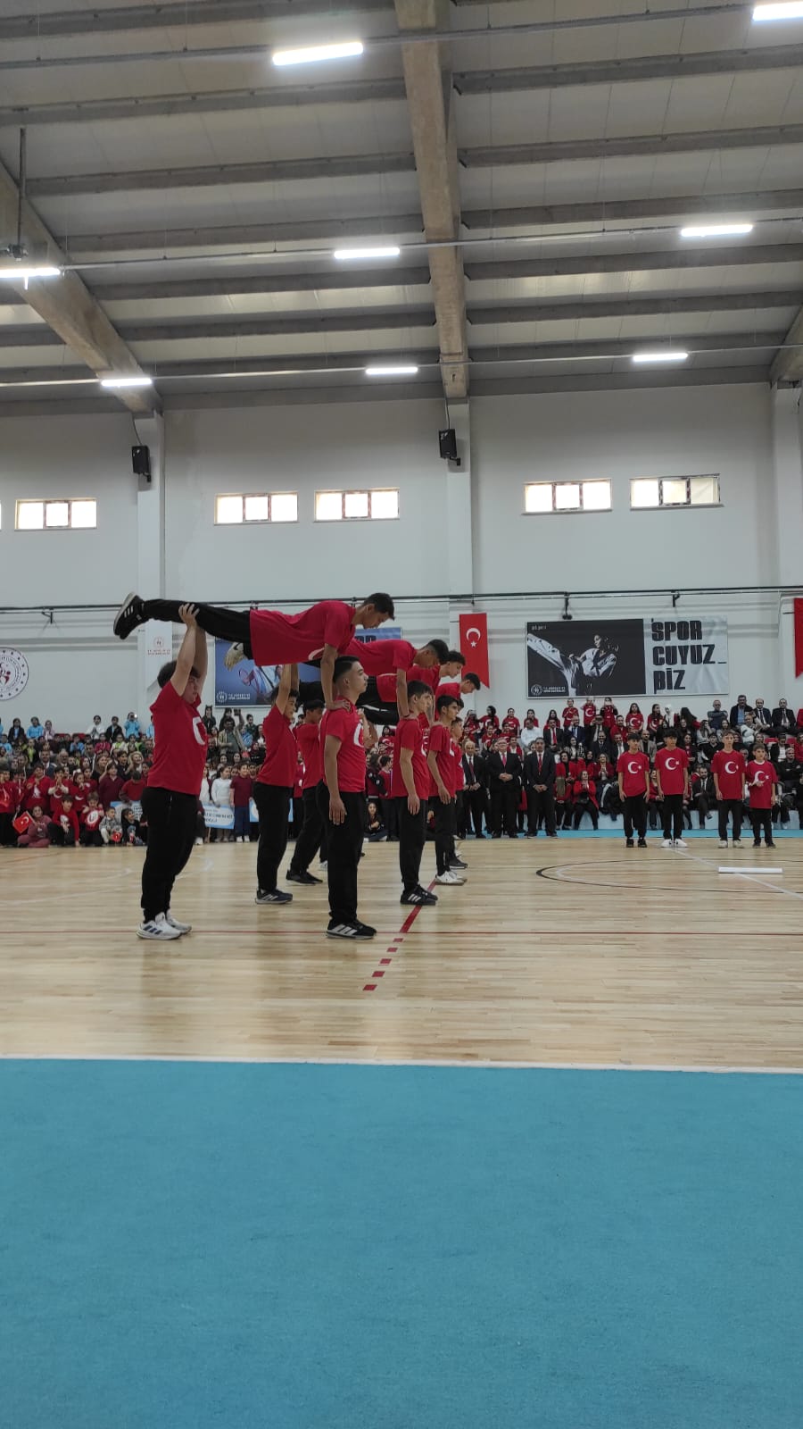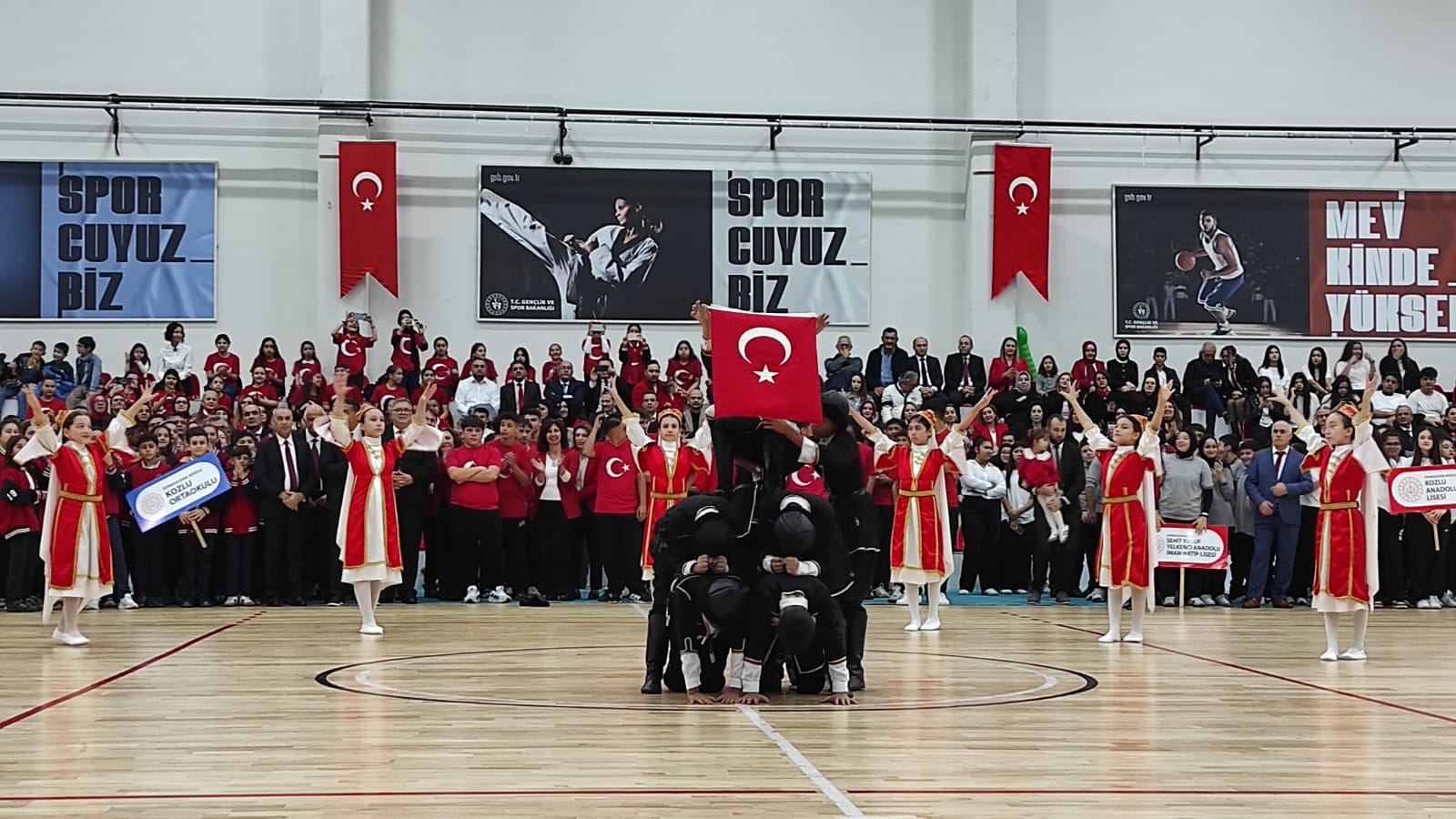 Cumhuriyet’imizin 102’nci yıldönümü ve 29 Ekim Cumhuriyet Bayramı, Kozlu İlçesi’nde de etkinliklerle kutlanıyor. Havanın yağışlı olması sebebiyle Kozlu Kapalı Spor Salonu’ndaki kutlama etkinlikleri, Türkiye Cumhuriyeti’nin Kurucusu Gazi Mustafa Kemal Atatürk ve silah arkadaşları başta olmak üzere vatanımızın bölünmez bütünlüğü uğruna canlarını feda eden aziz şehitlerimiz için 1 dakikalık saygı duruşu akabinde İstiklal Marşımızın söylenmesiyle başladı.