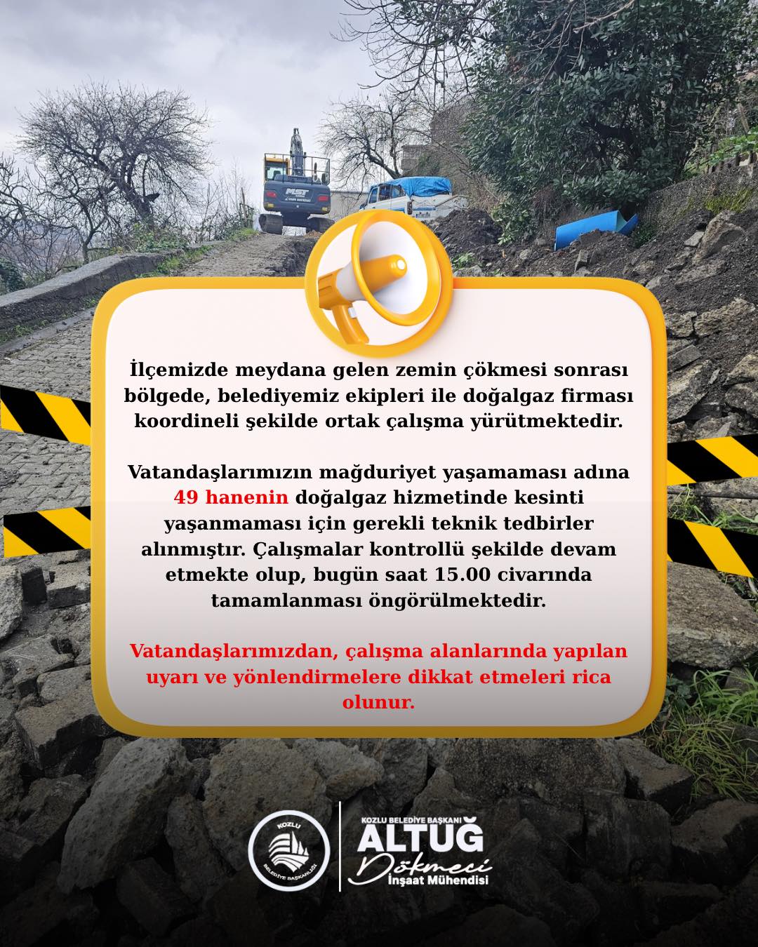 Kozlu ilçesinde meydana gelen zemin çökmesi sonrası bölgede belediye ekipleri ile doğalgaz firması koordineli şekilde çalışma yürütüyor.