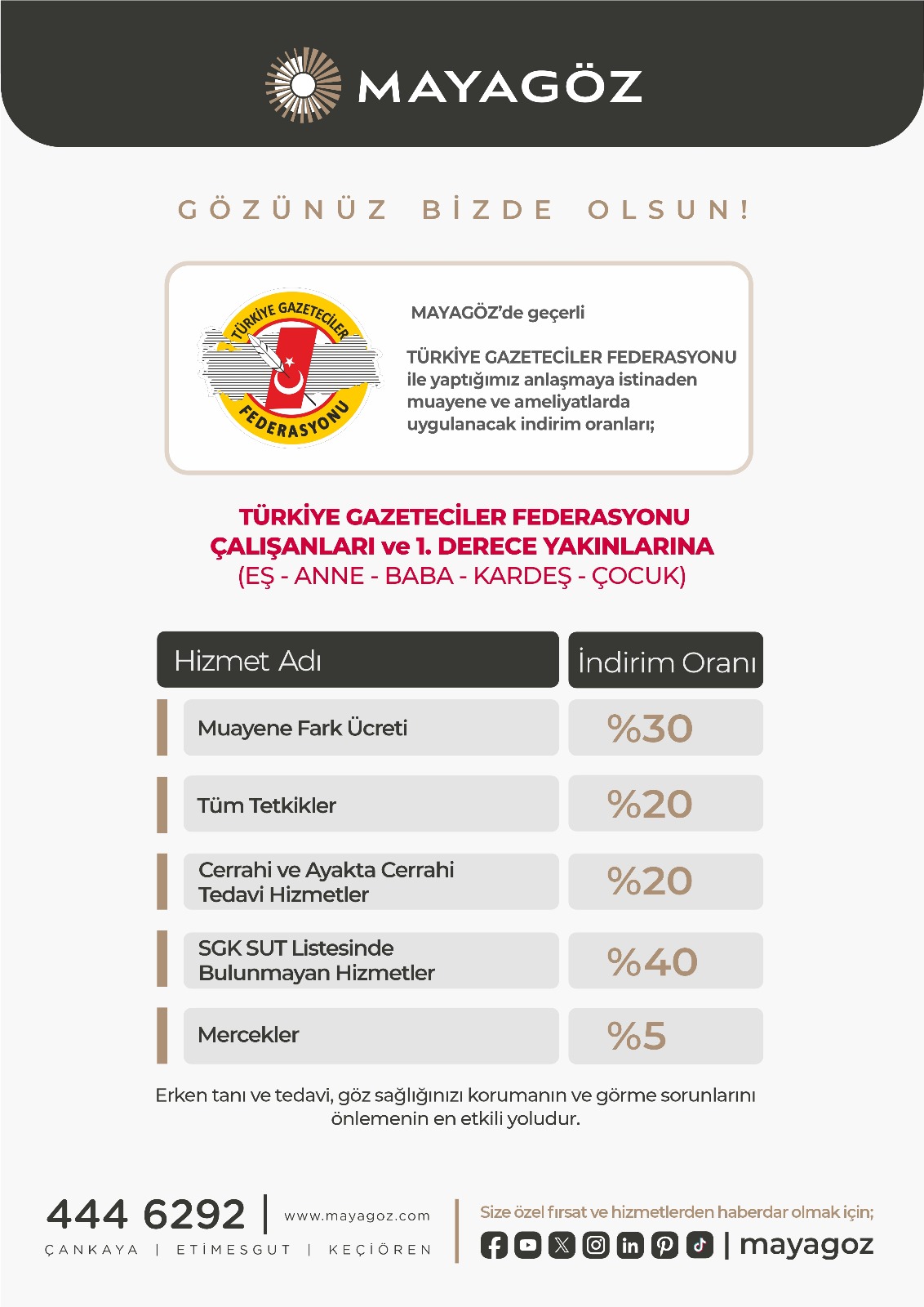Maya Göz Hastaneleri yöneticileri, Göz sağlığı alanında önemli bir yere sahip olan Mayagöz Hastanesi'nin sunduğu bu imkanla, TGF üyeleri göz muayenesi ve cerrahi operasyonlar dahil birçok hizmetten avantajlı fiyatlarla yararlanabilecek. “Sağlık alanında güven ve kaliteyi ön planda tutuyoruz. Gazetecilerimizin ve ailelerinin göz sağlığını korumak için her türlü desteği vereceğiz.” açıklamasında bulundu.