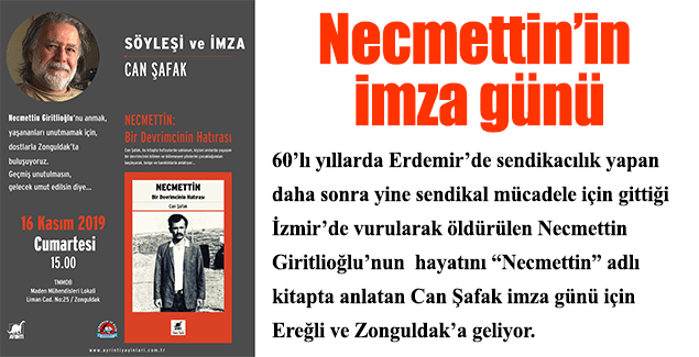 Ayrıntı Yayınları arasında çıkan kitabın imza günü 15 Kasım’da Ereğli’de, 16 Kasım’da da Zonguldak’ta yapılacak. Zonguldak Kültür ve Eğitim Vakfı’nın düzenlediği imza günlerine, o günleri tanığı ve Necmettin Giritlioğlu’nun yakın arkadaşı Bingöl Erdumlu da katılacak. İmza günleri Ereğli’de, Eski Bağlık Gazinosu’nda 17.00’de, Zonguldak’ta ise Maden Mühendisleri Odası’nda 15.00’de yapılacak. Şafak bu kitaptan başka, Ereğli 1965-1980 Çelik İşçileri, (Sosyal Tarih Yayınları, 2015), Ereğli 1960-65 Morrison’un Yapı İşçileri ((Sosyal Tarih Yayınları, 2017), ve Maden-İş Tarihine Tanıklıklar (2 cilt), (Sosyal Tarih Yayınları, 2019) adlı kitaplarında da Ereğli’de verilen sendikal mücadeleyi anlatıyor.