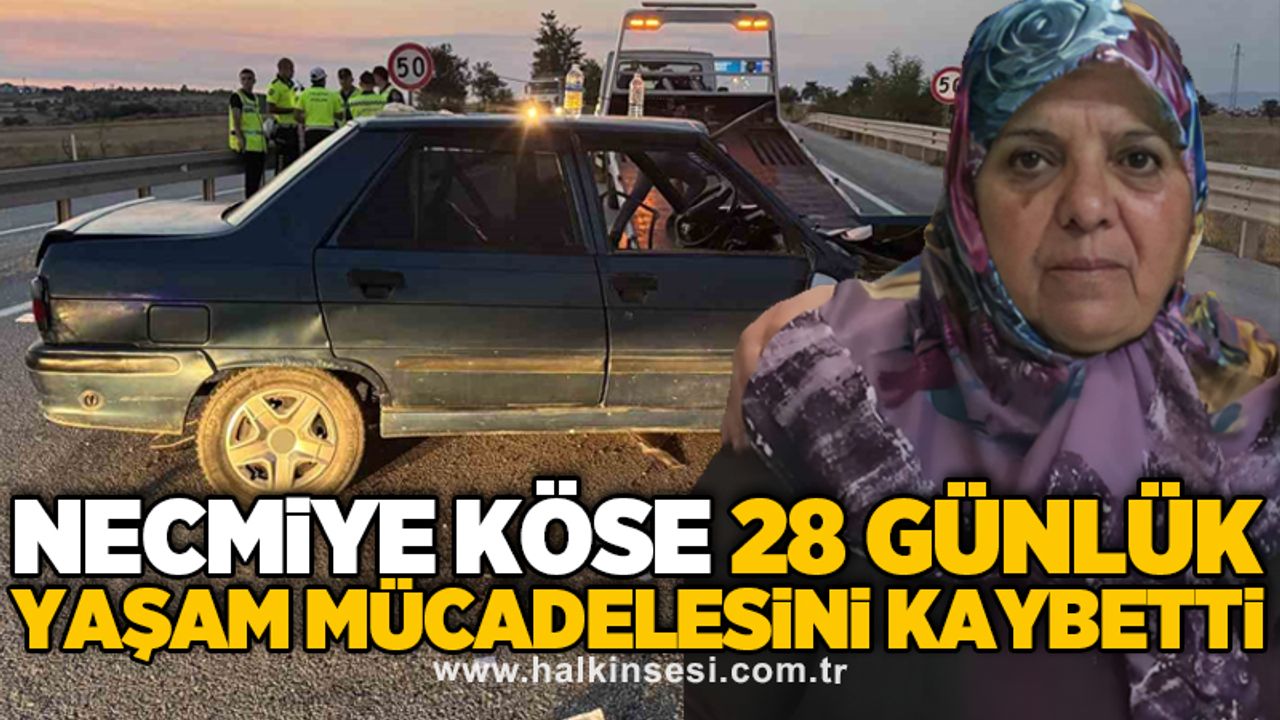 Kaza, 1 Eylül’de Kastamonu-Ankara Karayolu Kastamonu Havalimanı kavşağı mevkiinde meydana geldi. Edinilen bilgiye göre, Kastamonu istikametinde seyir halinde olan N.S. idaresindeki 37 PH 345 plakalı otomobil, sürücüsünün direksiyon hakimiyetini kaybetmesi neticesinde demir bariyerlere çarptı. Kazada sürücü ile araçta bulunan S.Z., N.Y., Necmiye Köse ve C.K. yaralandı. Yaralılar, olay yerine çağrılan sağlık ekiplerince Kastamonu Eğitim ve Araştırma Hastanesine kaldırıldı. Yoğun bakım ünitesinde tedavisi süren Necmiye Köse, 28 günlük yaşam mücadelesini kaybetti. Köse’nin cenazesi, hastanenin morguna kaldırıldı.