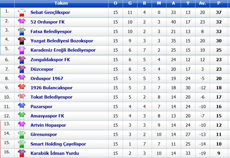 Şampiyonluk ve play-off mücadelesi veren 7 takımdan Sebat Gençlikspor 37 puanla ilk devreyi lider tamamladı. 52 Orduspor 32 puanla 2., Fatsa Belediyespor 32 puanla 3., Yozgat Belediyesi Bozukspor 30 puanla 4., temsilcilerimizden Kdz. Ereğli Belediyespor 25 puanla 5., Zonguldakspor 23 puanla 6, Düzcespor 23 7.sırada yer alıyor.