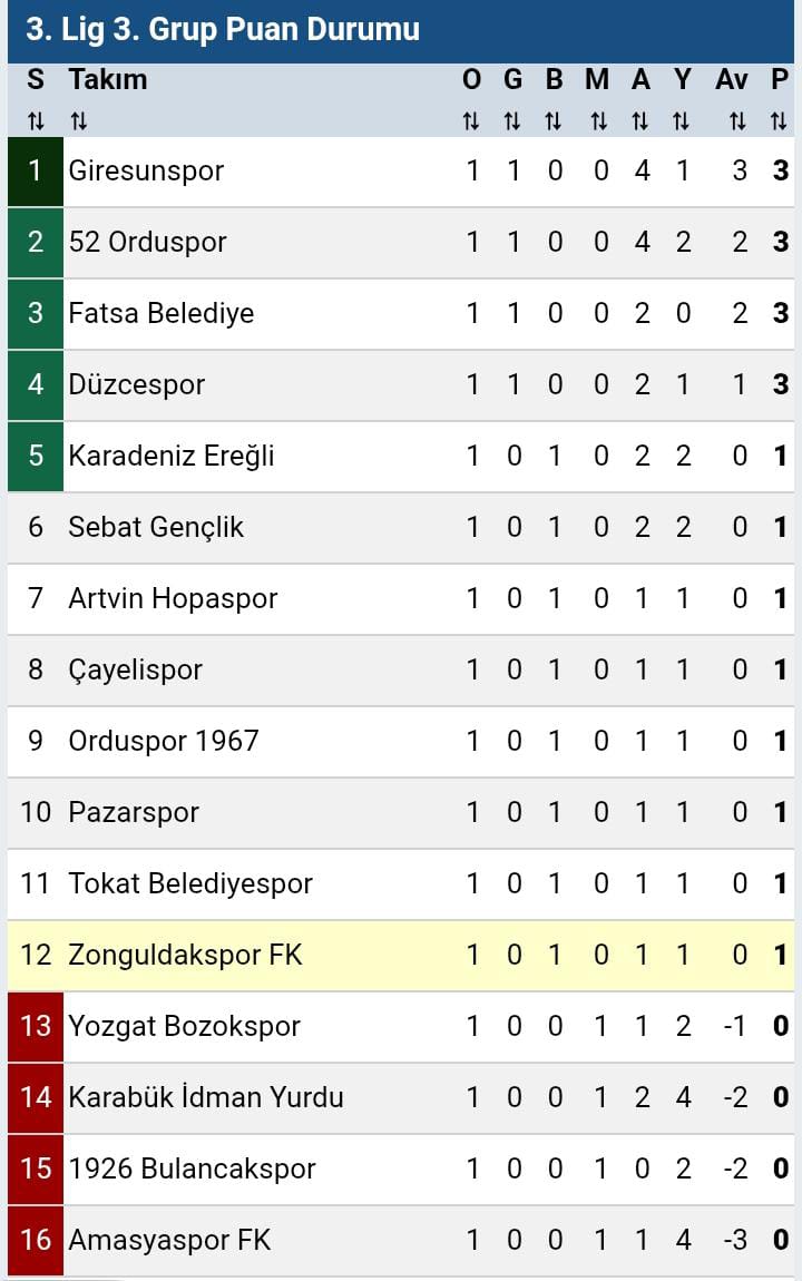 26 golün atıldığı ilk haftada Giresunspor, evinde Amasyaspor Fk'yı 4-1 yenerek haftayı averajla lider tamamladı. Temsilcilerimiz Zonguldakspor haftayı 12. sırada tamamlarken, Kdz. Ereğli Belediyespor'da haftayı 5. sırada tamamladı.