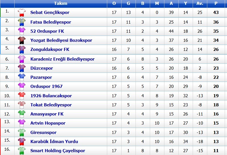 Sebat Gençlikspor, 52 Orduspor FK, Pazarspor, Fatsa Belediyespor 17. haftayı galibiyetle kapatırken Artvin Hopaspor, Amasyaspor FK, 1926 Bulancakspor, Orduspor 1967 haftayı yenilgi ile kapattılar. Temsilcimiz Kdz. Ereğli Belediyespor, Yozgat Belediyesi Bozokspor, Tokat Belediyespor, Karabük İdman Yurdu, Giresunspor, Smart Holding Çayelispor ise haftayı 1’er puanla kapattılar.
