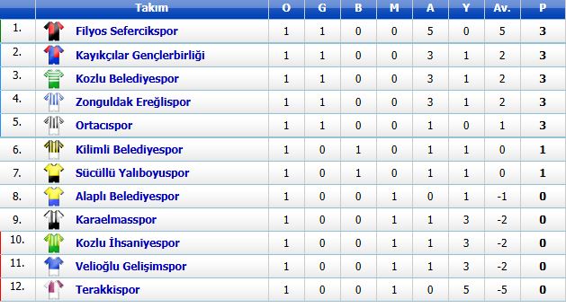 Sefercikspor, Kayıkcılar Gençlerbirliği, Kozlu Belediyespor, Zonguldak Ereğlispor ve Ortacıspor ilk haftayı 3’er puanla kapatırken, Kilimli Belediyespor ve Sücüllü Yalıboyuspor’da haftayı 1’er puanla kapattılar.