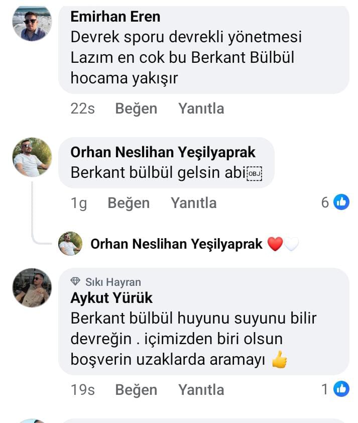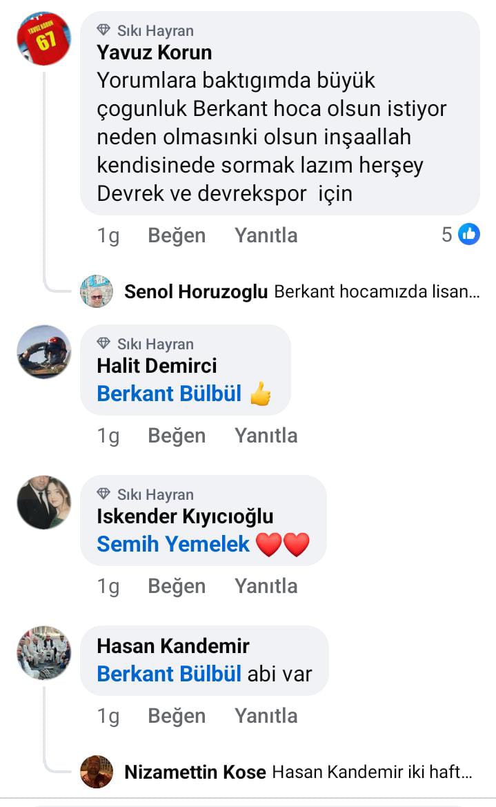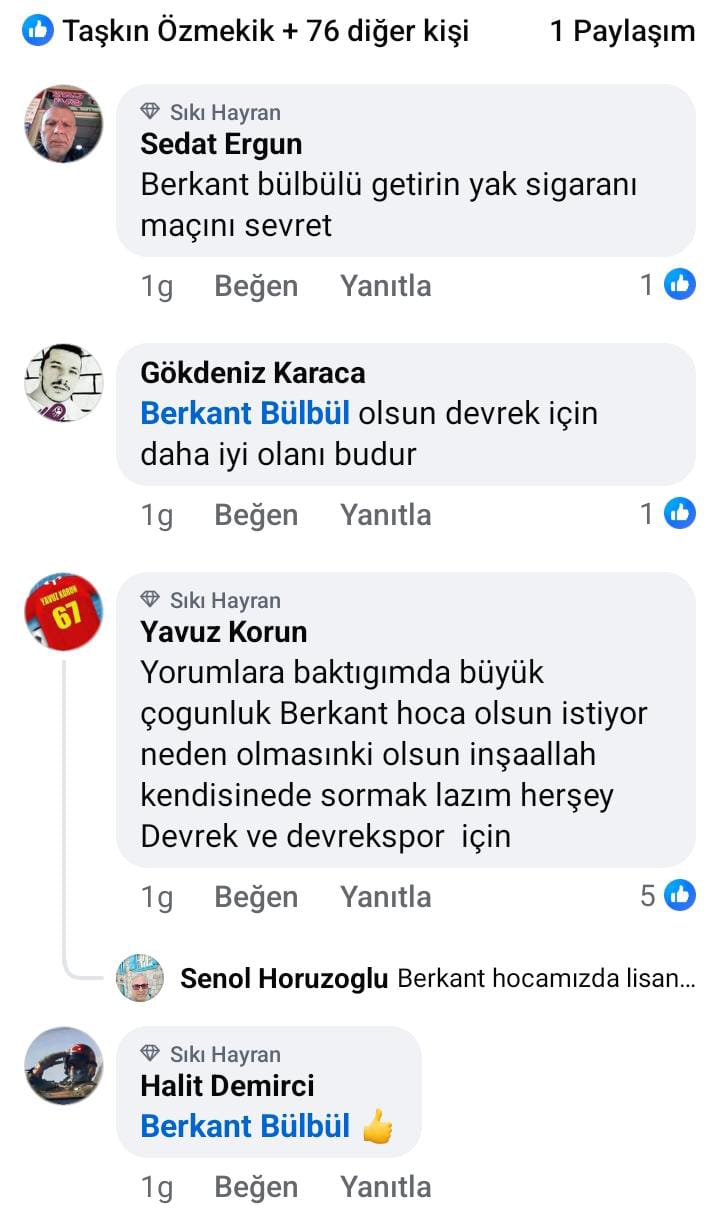 Kırmızı-beyazlı taraftarlar, şampiyonluk isteniliyorsa, bu takıma Devrek Belediyespor formasının ağırlığını bildirecek, doğru dürüst top oynatacak, özellikle Devrek halkının ne istediğini bildirecek bir teknik adam olması gerektiğini ifade ederken bunu yaptıracak teknik adamın da Devrek'in öz evladı Berkant Bülbül'den başkası olmadığını söylediler.