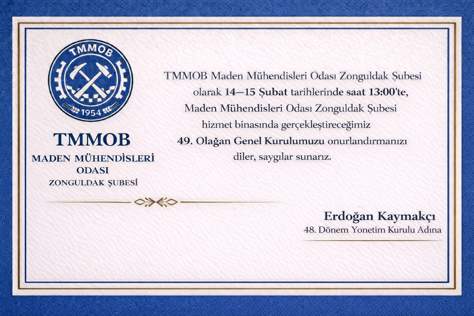 Genel kurulun, oda faaliyetlerinin değerlendirilmesi ve yeni dönem yönetiminin belirlenmesi açısından önem taşıdığı belirtildi. Davet, 48. Dönem Yönetim Kurulu adına Erdoğan Kaymakçı imzasıyla paylaşıldı.