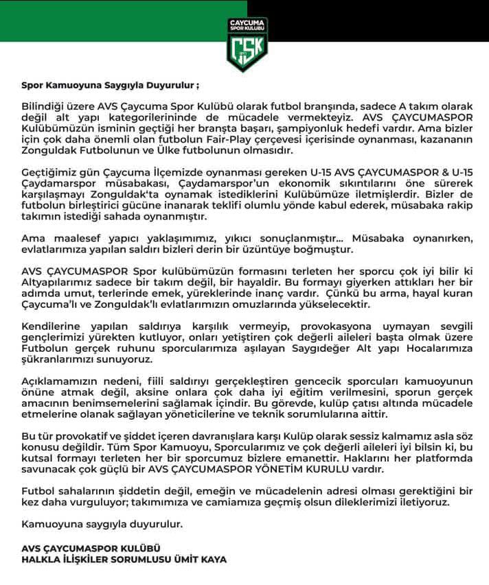 U-15 takımımızın Çaydamarspor ile oynadığı karşılaşmada, iyi niyetle kabul ettiğimiz saha değişikliğine rağmen sporcularımıza yönelik yaşanan saldırı bizleri derinden üzmüştür. Buna rağmen evlatlarımızın provokasyona kapılmadan sportmenliğini koruması gurur vericidir.