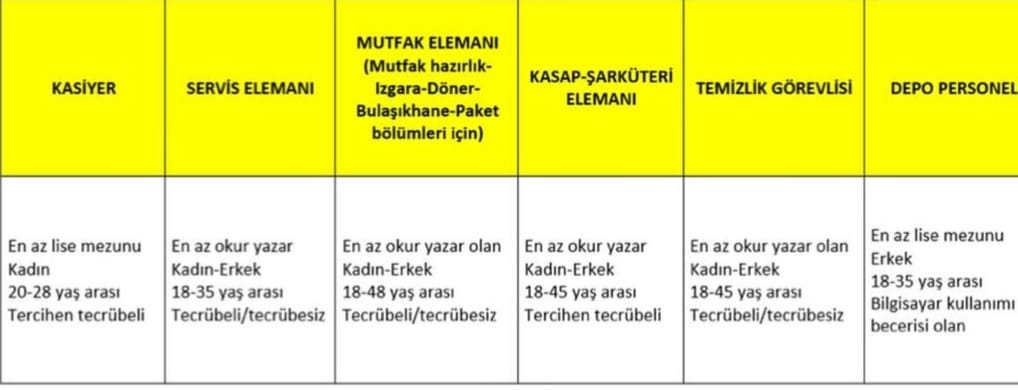 Kilimli Deniz caddesi'nde açılacak olan köfteci Yusuf'a alınacak olan personellerin İŞKUR üzerinden müracaatlarını yapmaları istendi. İşe alınacakların olanların mülakatı İŞKUR toplantı salonunda 25 Kasım'da saat 14.00 ile 15.30 arasında gerçekleşeceği duyuruldu. İşte aranan şartlar: