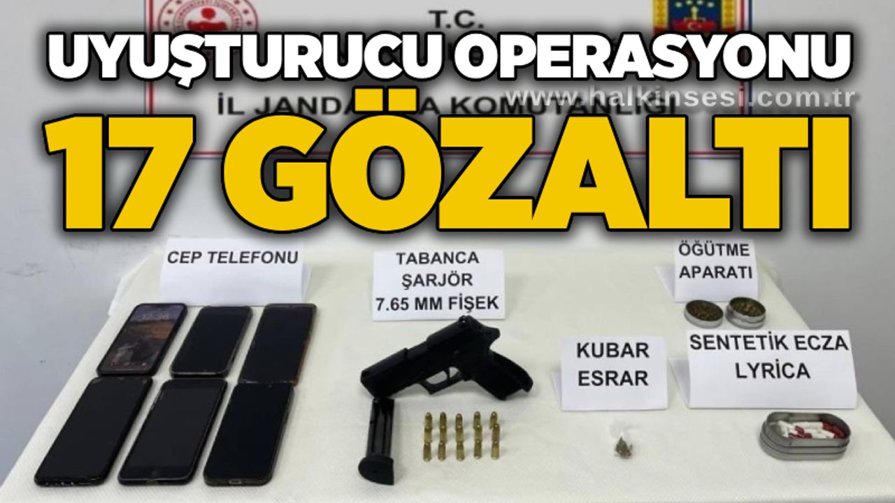 Çanakkale Cumhuriyet Başsavcılığı koordinesinde, İl Jandarma Komutanlığı ekiplerince uyuşturucu ve uyarıcı madde ile mücadele çerçevesinde 5-17 Kasım tarihleri arasında il merkezi ve ilçelerde, 17 şüpheliye ait 11 adrese operasyon gerçekleştirildi. Yapılan aramalarda 36 gram kubar esrar, 35 gram sentetik kannabinoid hammadde, 17 gram sentetik kannabinoid, 10 gram skunk, 10 gram kenevir tohumu, 10 adet sentetik ecza, 2 adet ruhsatsız 9 milimetre tabanca, ruhsatsız 7.65 milimetre tabanca, 65 adet 9 milimetre ve 15 adet 7.65 milimetre tabanca fişeği, uyuşturucu öğütme aparatı, 3 adet uyuşturucu kullanma aparatı (payp), 29 adet uyuşturucu kullanma aparatı (kova), 6 adet cep telefonu, 3 bin 200 TL suç geliri para ele geçirildi. Operasyonlarda gözaltına alınan 17 şüpheliden 1'i çıkarıldığı mahkemece tutuklanarak cezaevine sevk edildi.