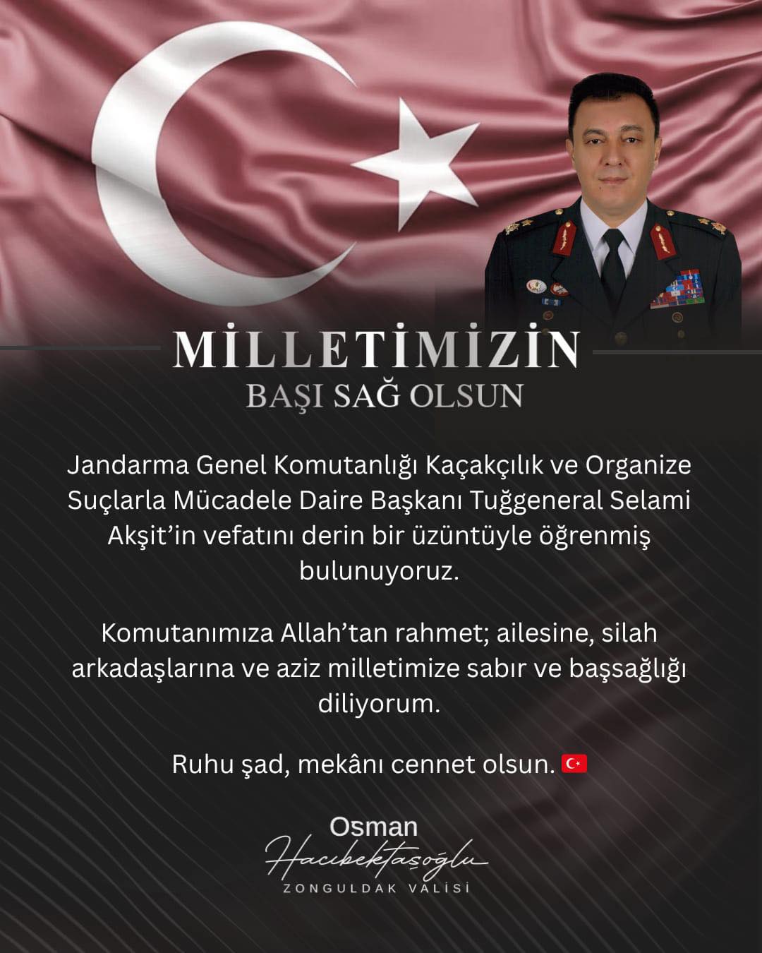 Zonguldak Valisi Osman Hacıbektaşoğlu, Jandarma Genel Komutanlığı Kaçakçılık ve Organize Suçlarla Mücadele Daire Başkanı Tuğgeneral Selami Akşit’in vefatı dolayısıyla bir taziye mesajı yayımladı.