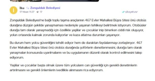 Şikayetvar.com üzerinden yapılan başvuruda, 467 Evler Mahallesi Büşra Sitesi önünde bulunan otobüs durağında araçların durağa tam yanaşmadığı ve bu durumun ciddi tehlikelere yol açtığı belirtildi.