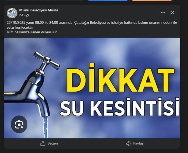 Zonguldak’ın Kilimli ilçesine bağlı Muslu Belediyesi, yaptığı yazılı açıklamayla vatandaşları su kesintisi konusunda uyardı. Açıklamaya göre, 23 Ekim 2025 Perşembe günü saat 08.00 ile 24.00 arasında, Çatalağzı Belediyesi su isale hattında yapılacak bakım ve onarım çalışmaları nedeniyle bölgede planlı su kesintisi uygulanacak.