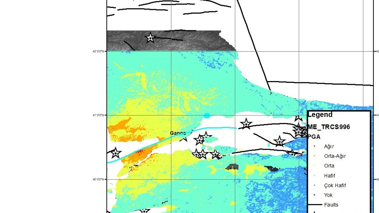 Kutoğlu açıklamasında, “Geliştirdiğimiz CBS tabanlı yazılımla olası büyük depremde KAF'nın Marmara Denizindeki Kuzey-Doğu kolundaki potansiyel hasar tahminini paylaşmıştık. Şimdi de Kuzey-Doğu kolunu hesaplattık. Kırmızı ve turuncu alanlar öncelikli zarar azaltma çalışması yapılması gereken alanlardır.