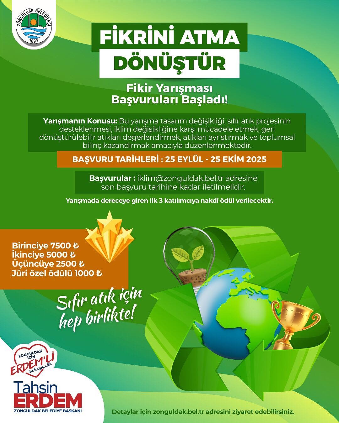Zonguldak Belediyesi tarafından "Fikrini Atma, Dönüştür" başlıklı fikir yarışması düzenlenecek. Yarışmada sıfır atık ve sürdürülebilir bir geleceğe uygun önemli projeler oylanacak ve jüri tarafından uygun görülen proje sahibi ödül almaya hak kazanacak.